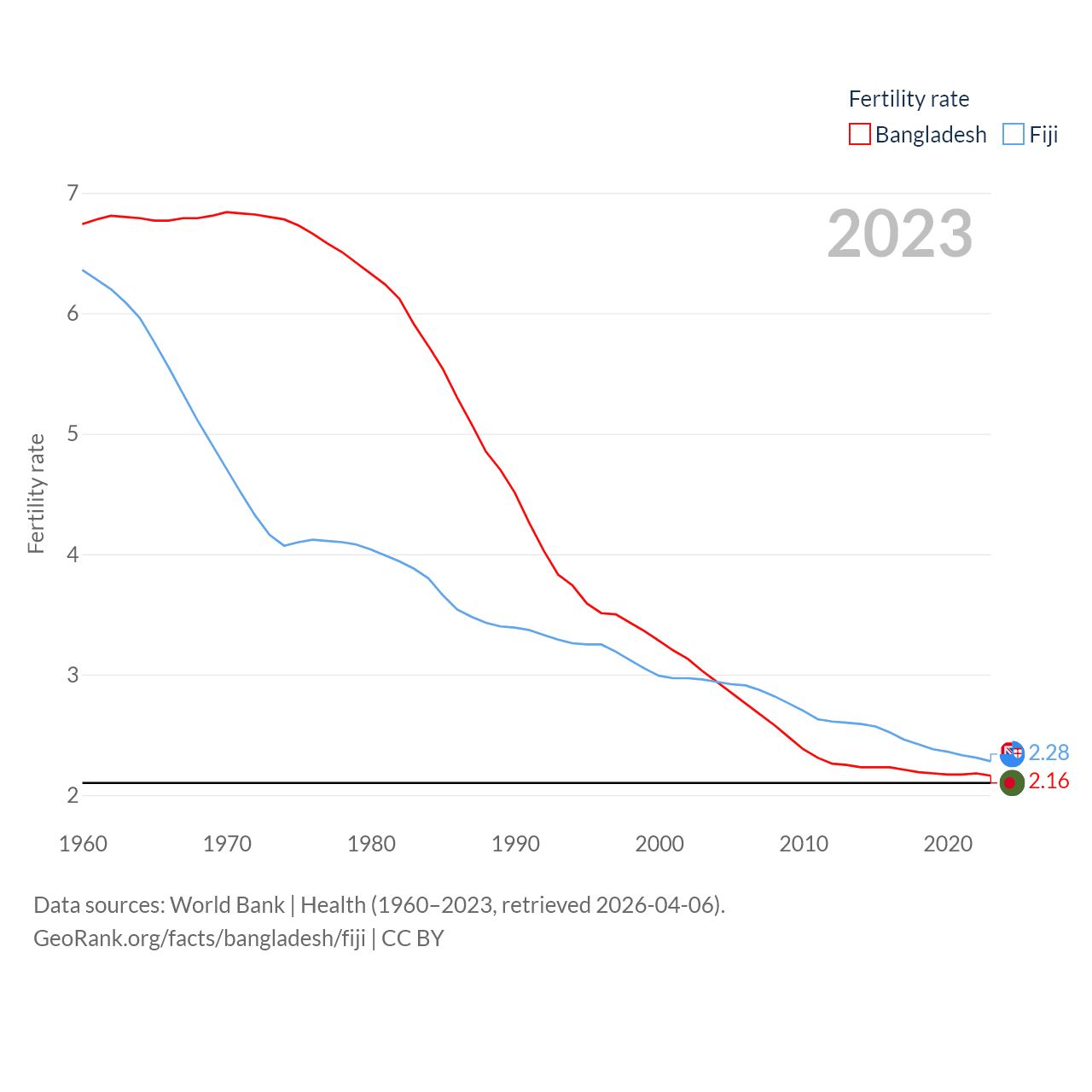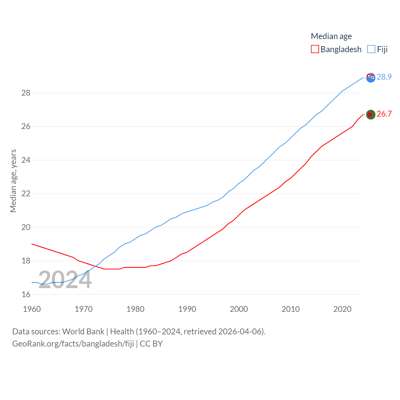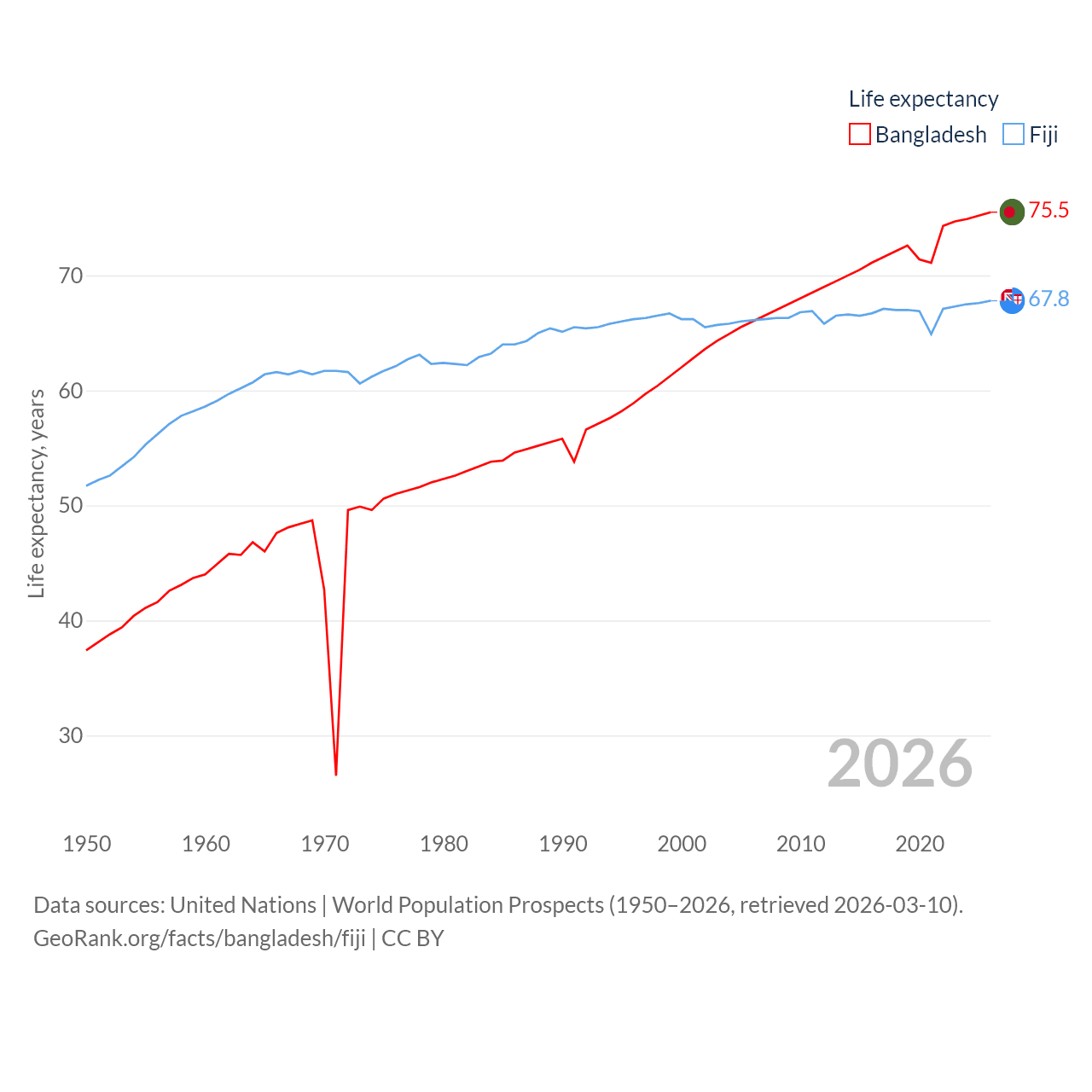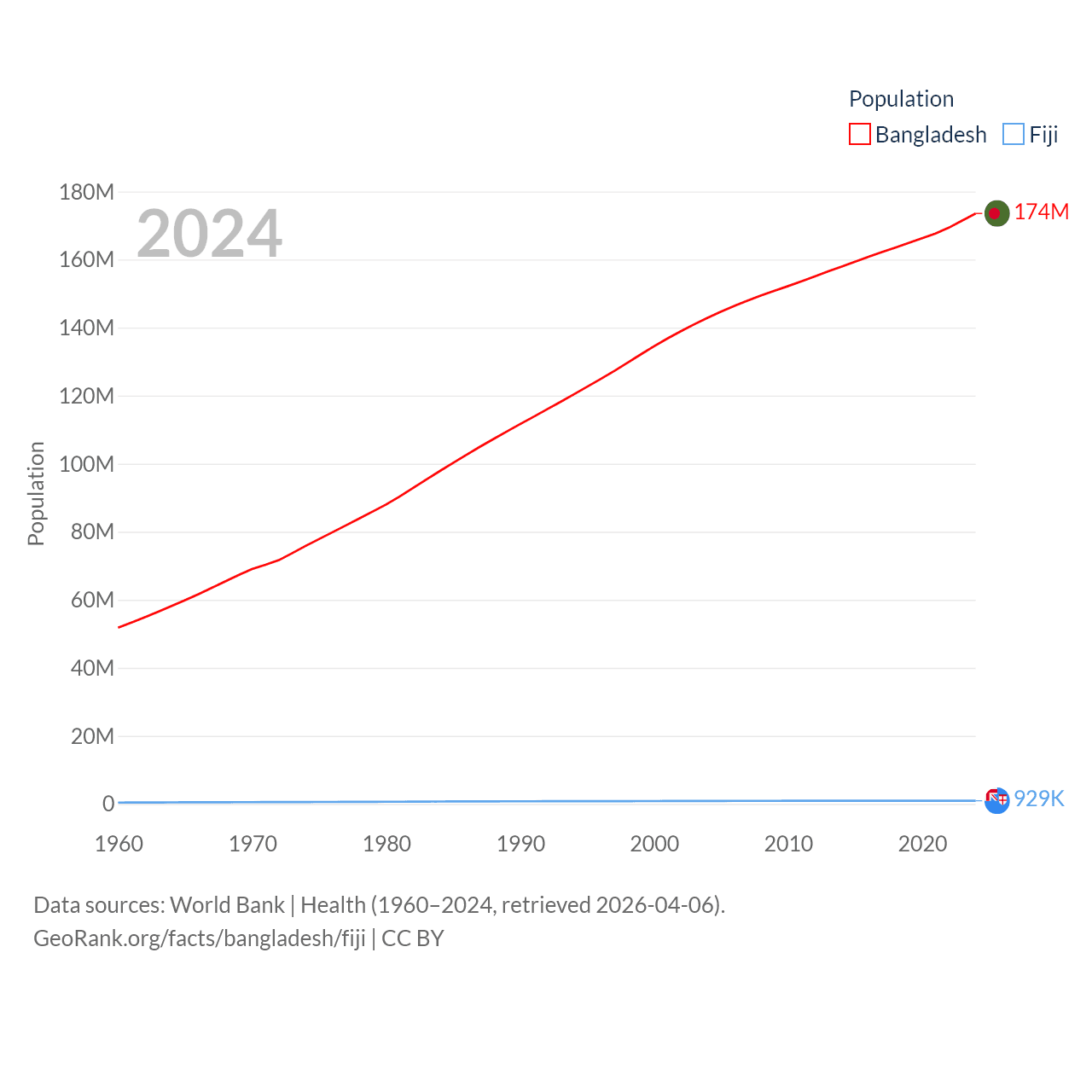 Bangladesh has a population of 174M (ranked 8/197), compared with 929K in Fiji (ranked 159/197). Bangladesh's land area is 50,186 sq mi versus 7,054 sq mi for Fiji (ranked 94th vs. 152nd).