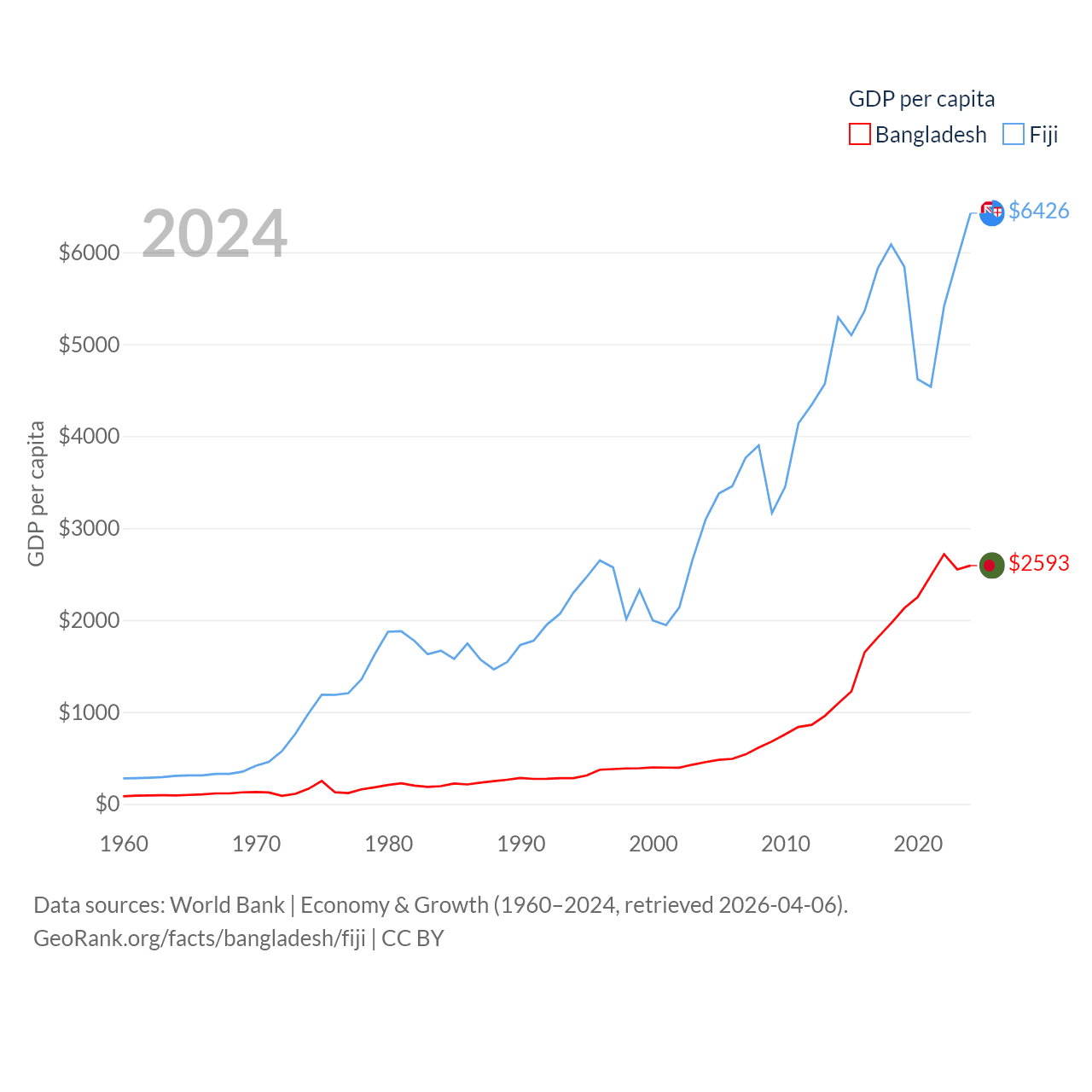 By GDP, Bangladesh ranks 36/197 ($450B) and Fiji ranks 161/197 ($5.97B). By GDP per capita, Bangladesh ranks 146/197 ($2,593), while Fiji ranks 108/197 ($6,426).