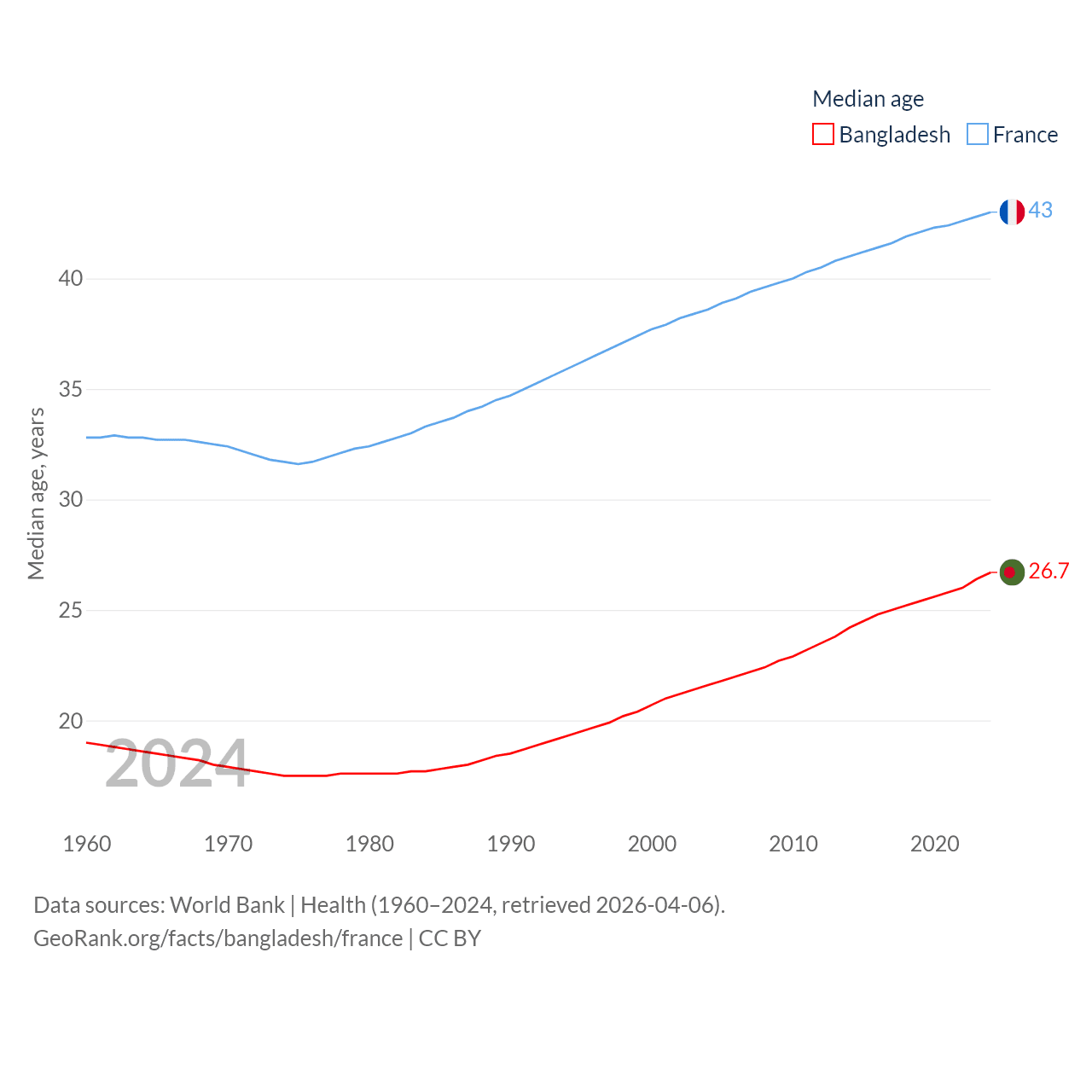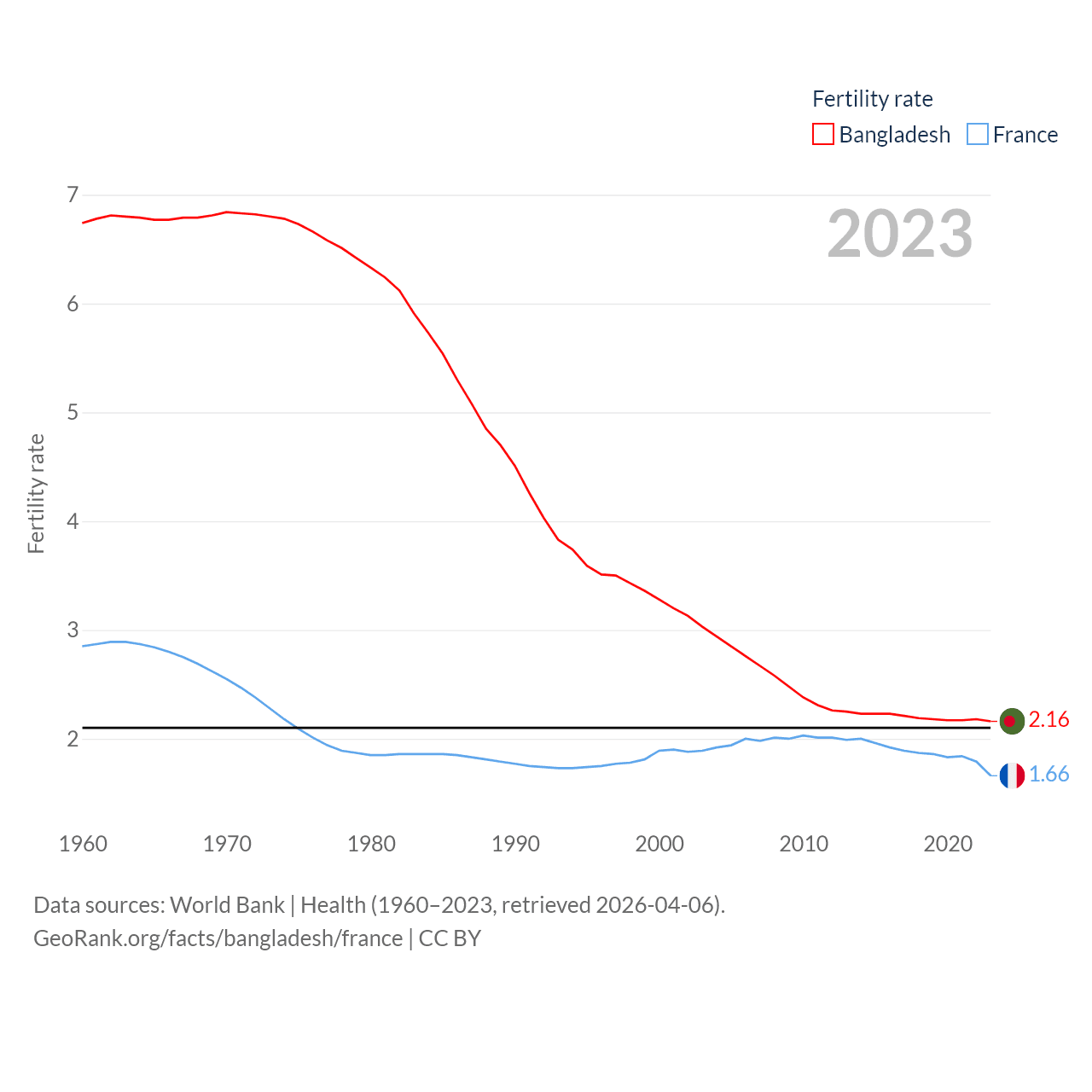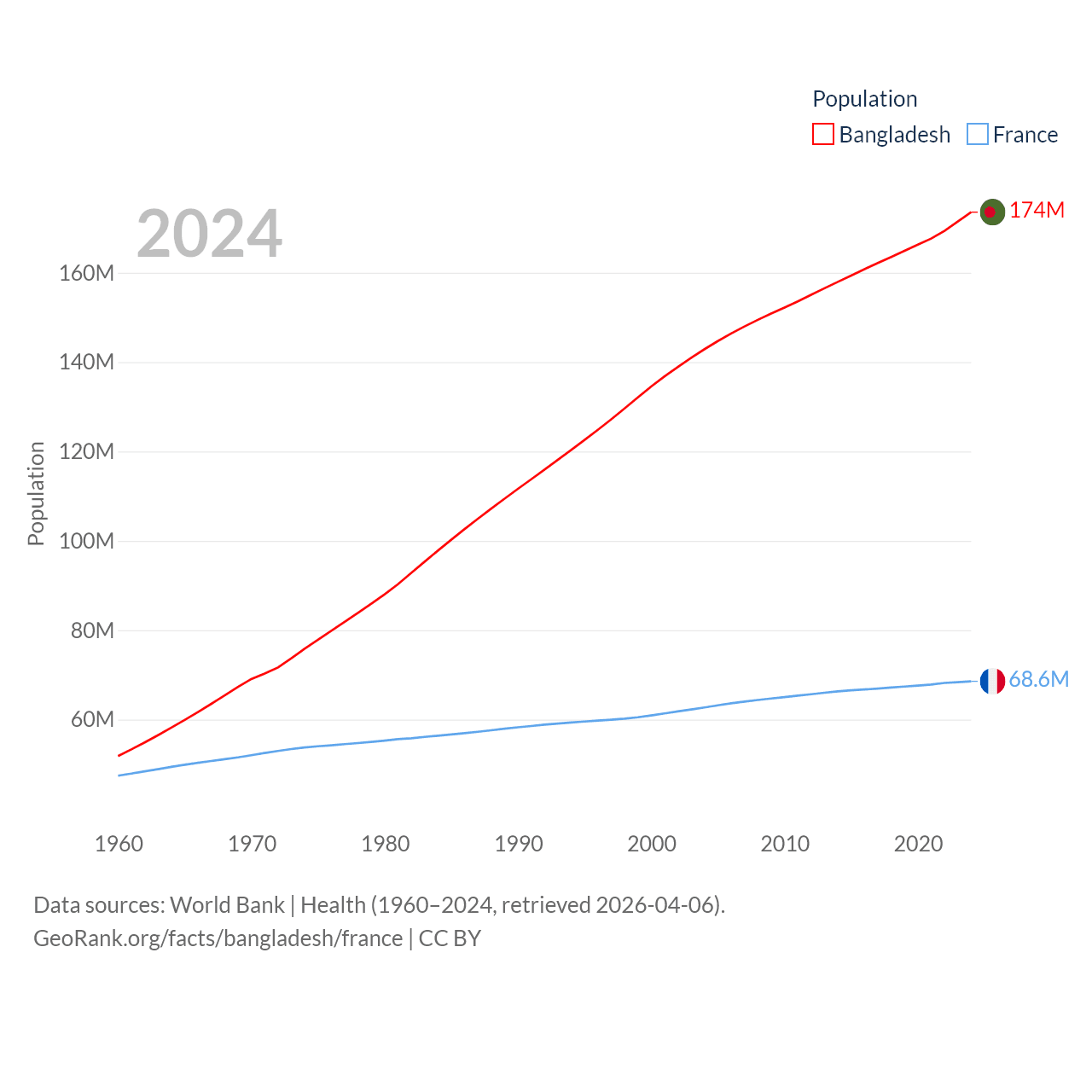 Bangladesh has a population of 174M (ranked 8/197), compared with 68.6M in France (ranked 23/197). Bangladesh's land area is 50,186 sq mi versus 208,090 sq mi for France (ranked 94th vs. 48th).