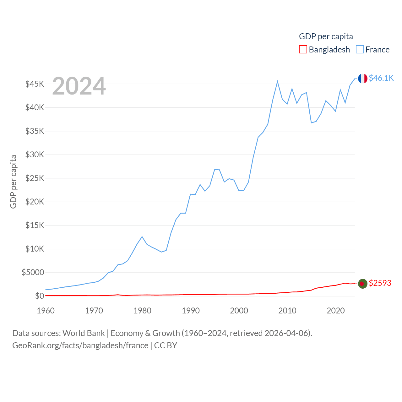 By GDP, Bangladesh ranks 36/197 ($450B) and France ranks 7/197 ($3.16T). By GDP per capita, Bangladesh ranks 146/197 ($2,593), while France ranks 27/197 ($46,103).