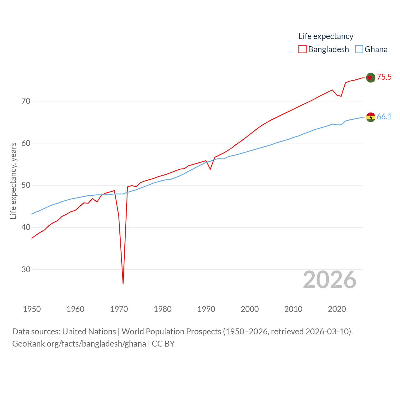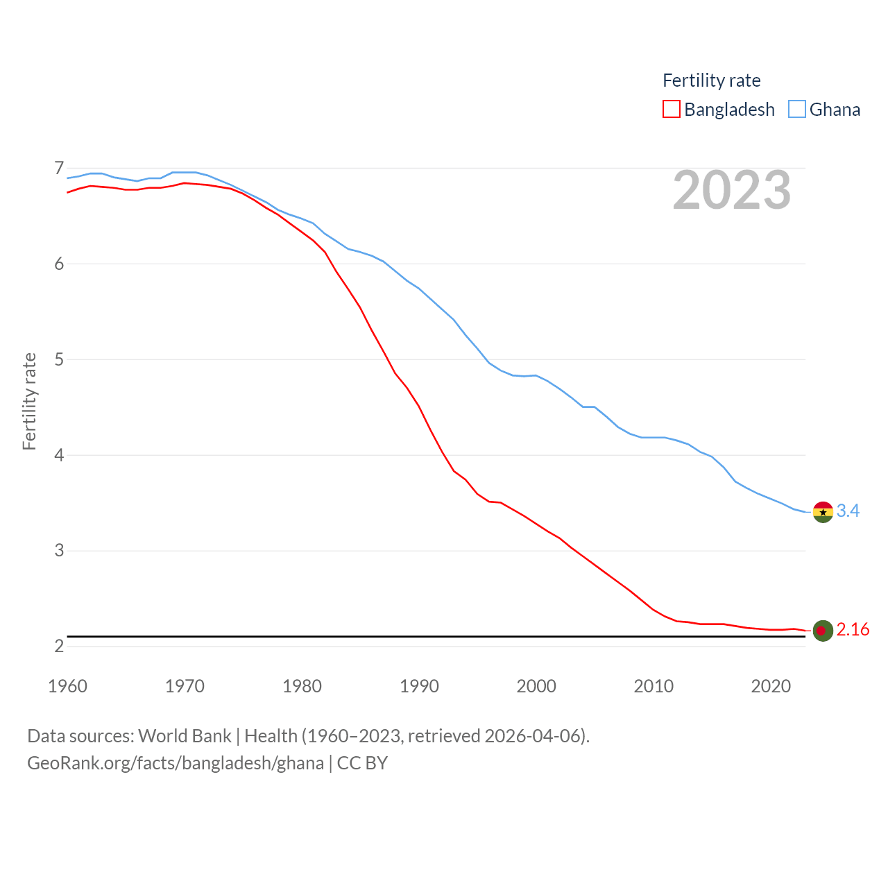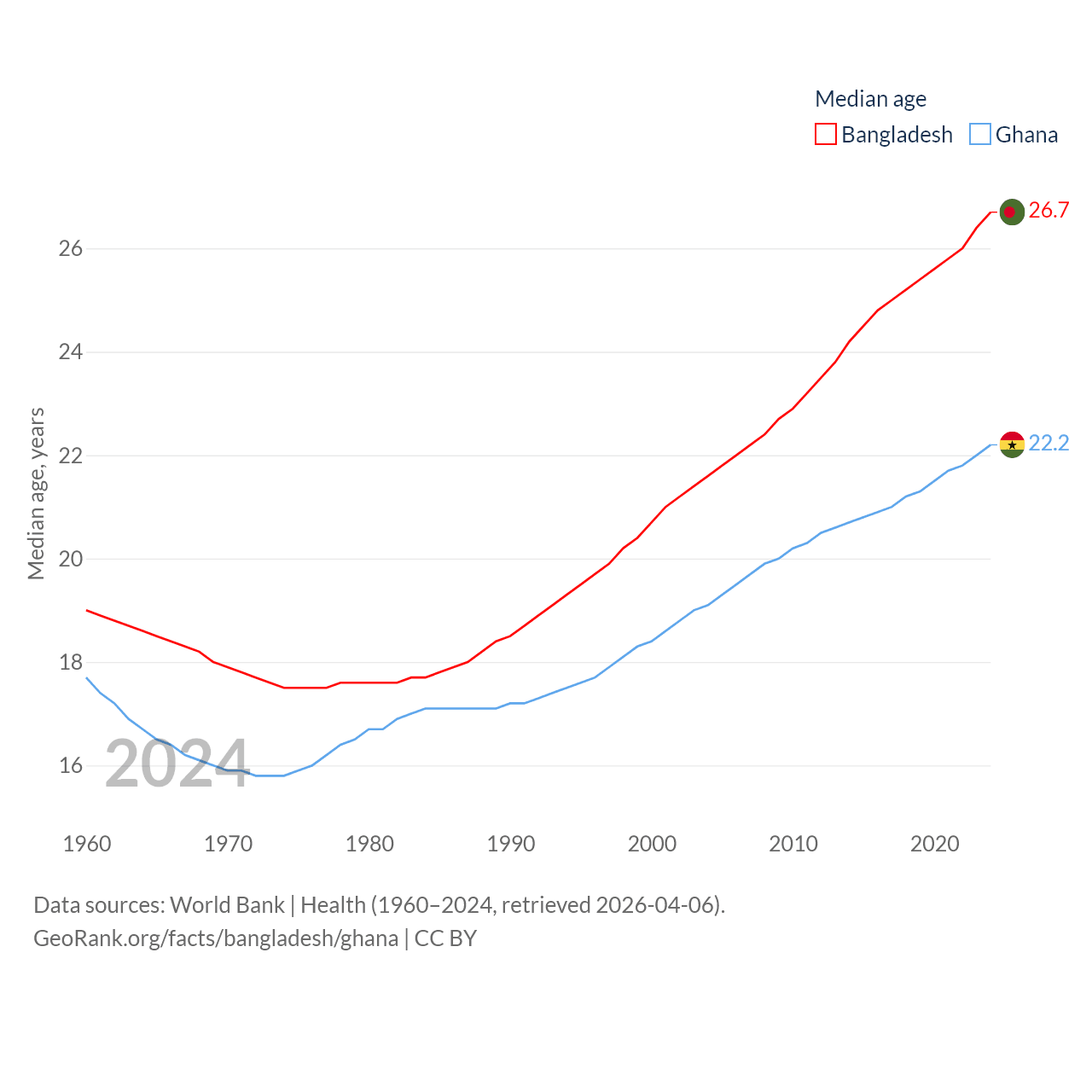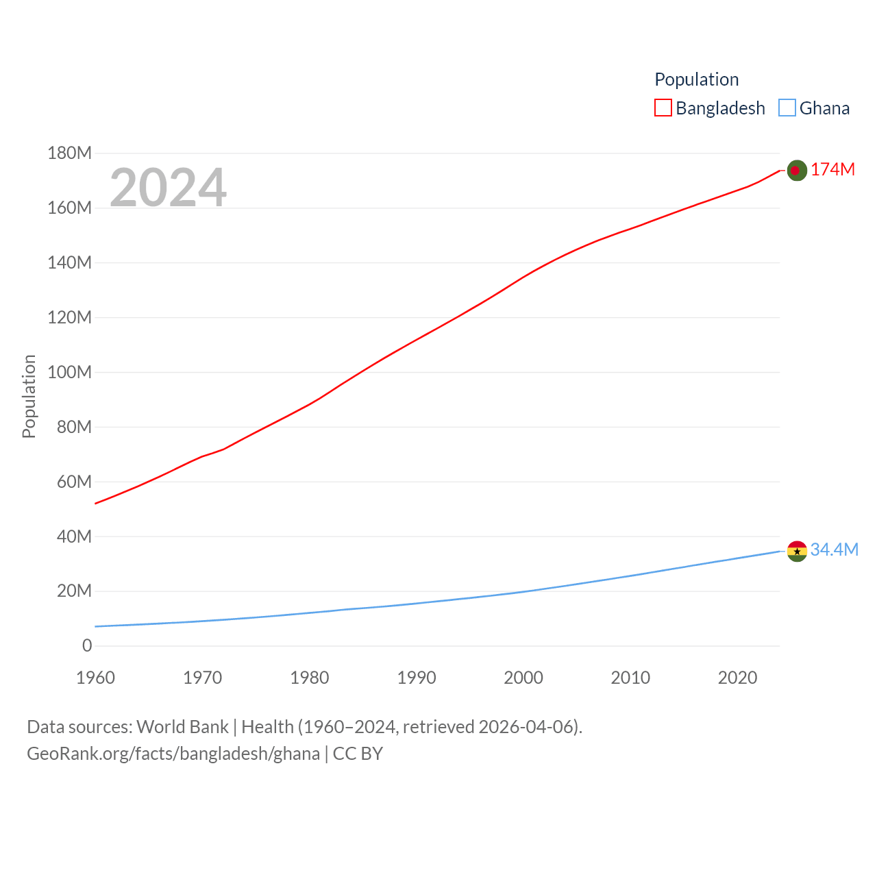 Bangladesh has a population of 174M (ranked 8/197), compared with 34.4M in Ghana (ranked 47/197). Bangladesh's land area is 50,186 sq mi versus 87,851 sq mi for Ghana (ranked 94th vs. 81st).