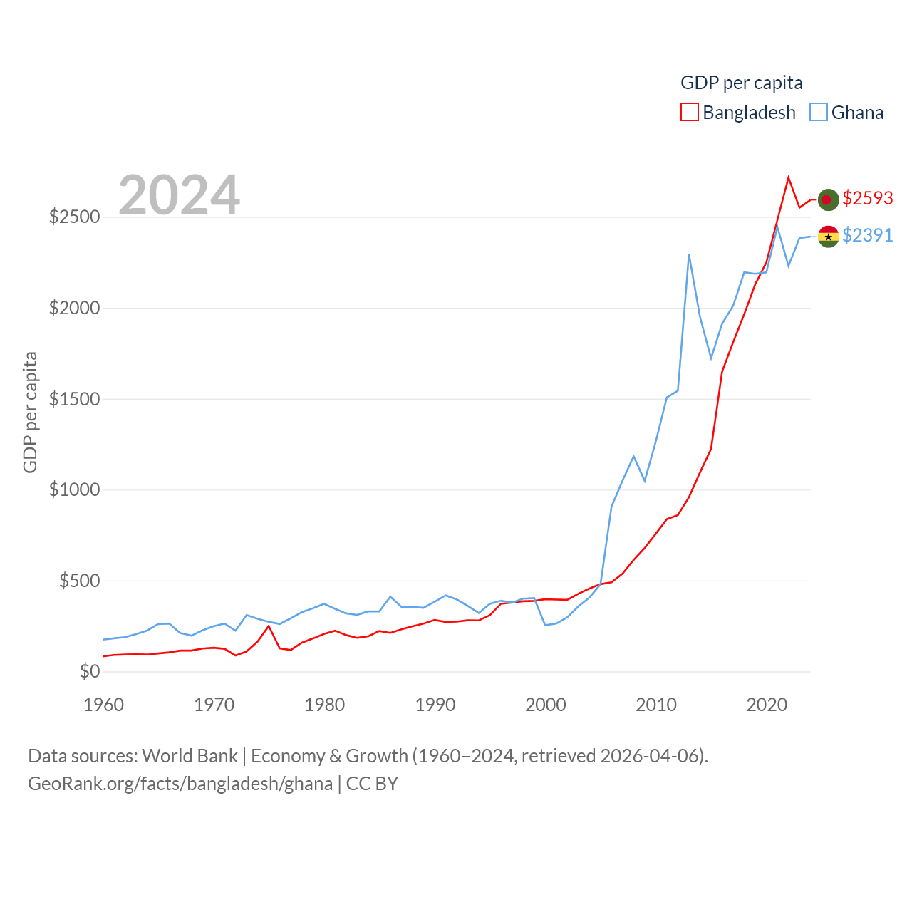 By GDP, Bangladesh ranks 36/197 ($450B) and Ghana ranks 80/197 ($82.3B). By GDP per capita, Bangladesh ranks 146/197 ($2,593), while Ghana ranks 151/197 ($2,391).