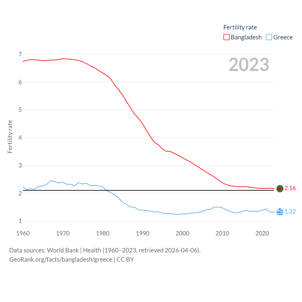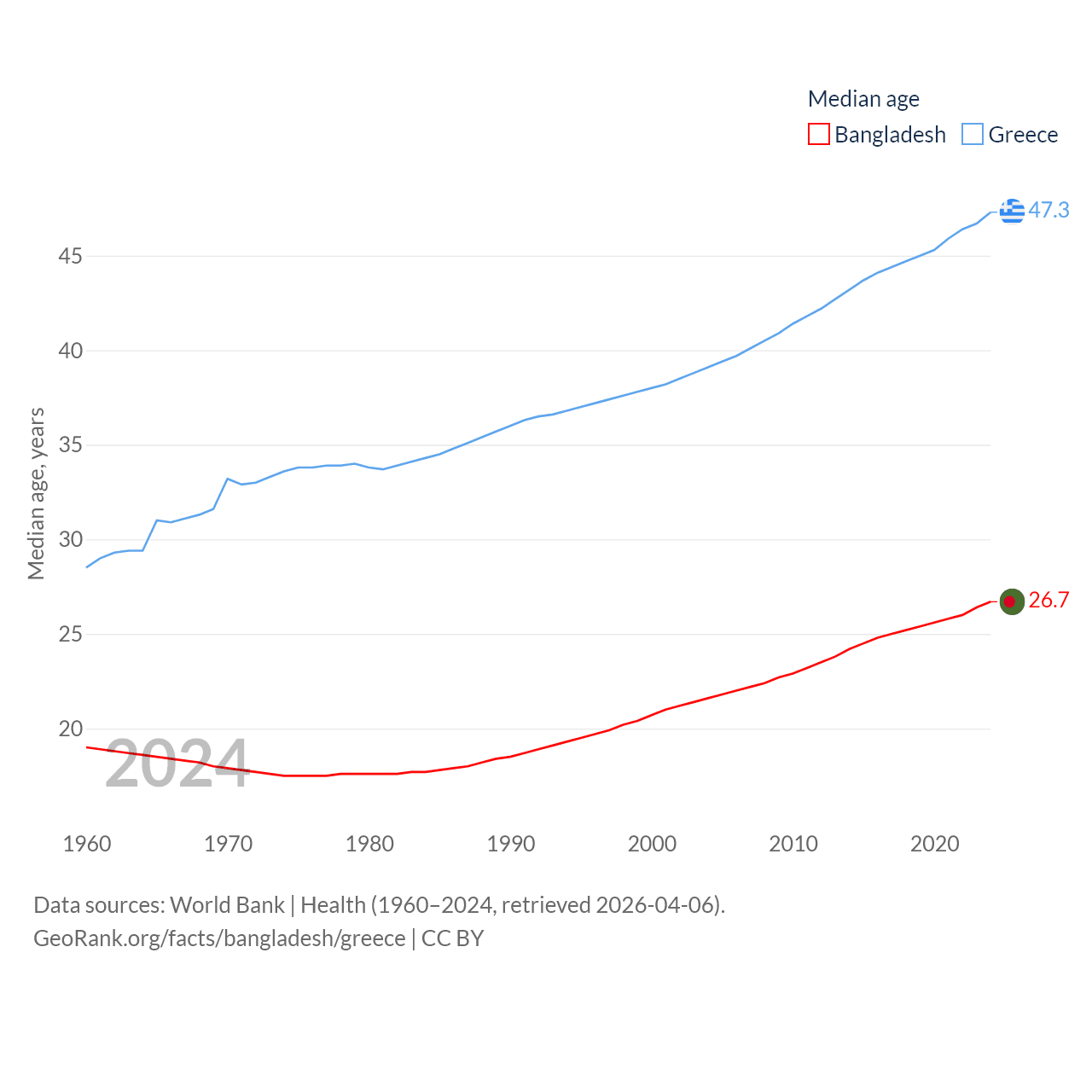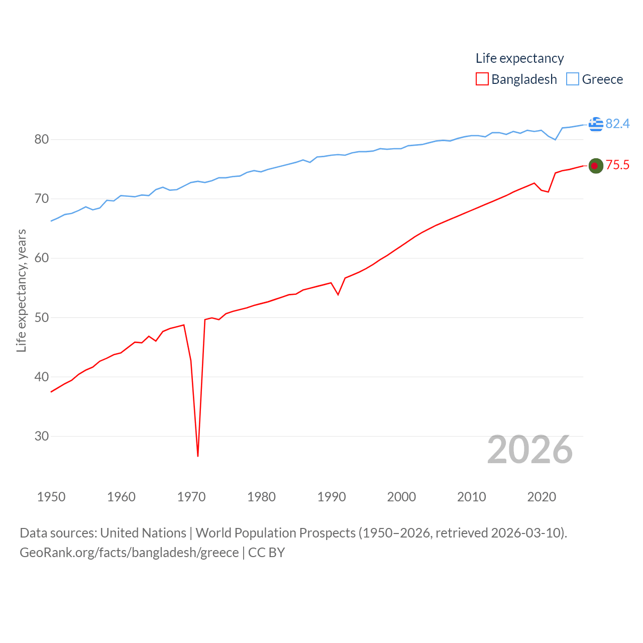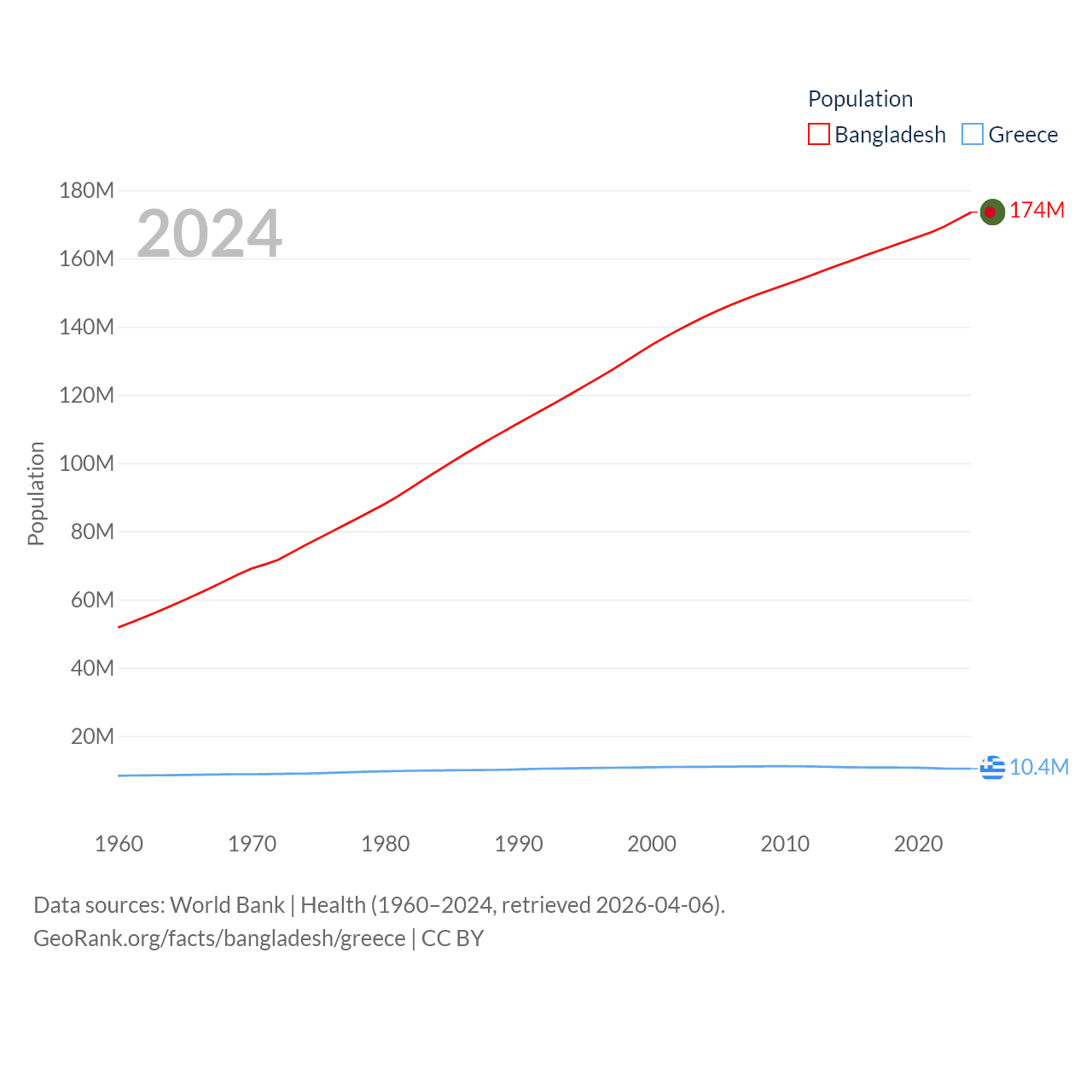 Bangladesh has a population of 174M (ranked 8/197), compared with 10.4M in Greece (ranked 94/197). Bangladesh's land area is 50,186 sq mi versus 49,769 sq mi for Greece (ranked 94th vs. 95th).