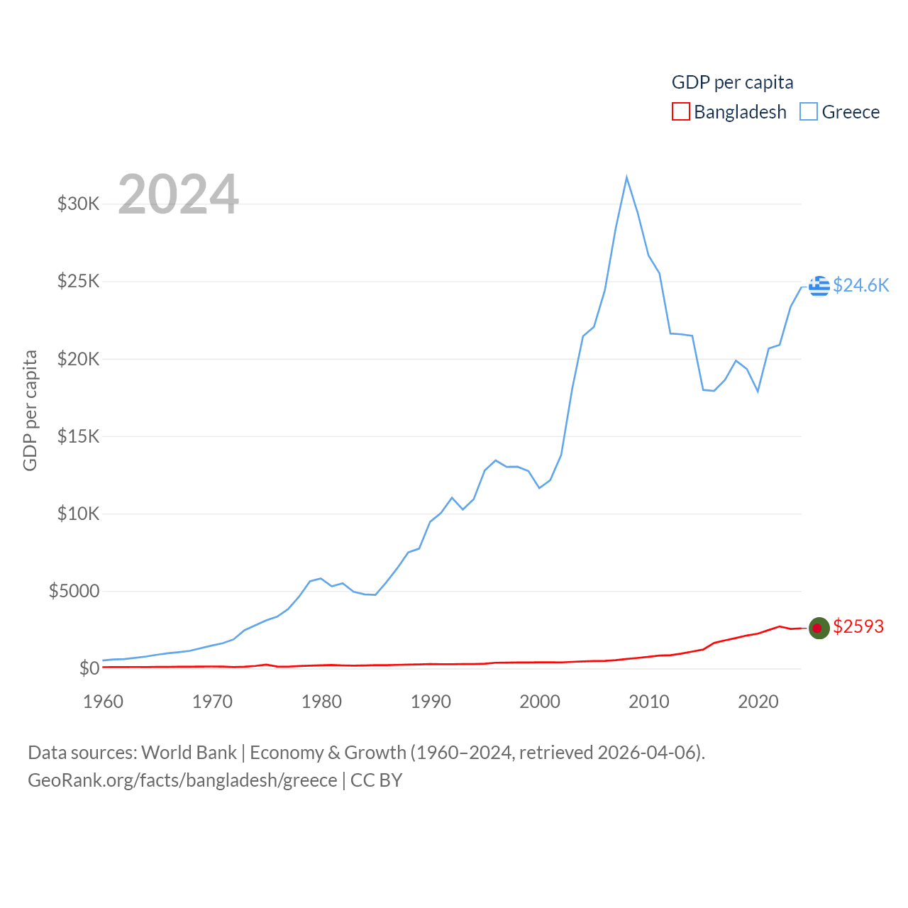 By GDP, Bangladesh ranks 36/197 ($450B) and Greece ranks 53/197 ($256B). By GDP per capita, Bangladesh ranks 146/197 ($2,593), while Greece ranks 49/197 ($24,626).