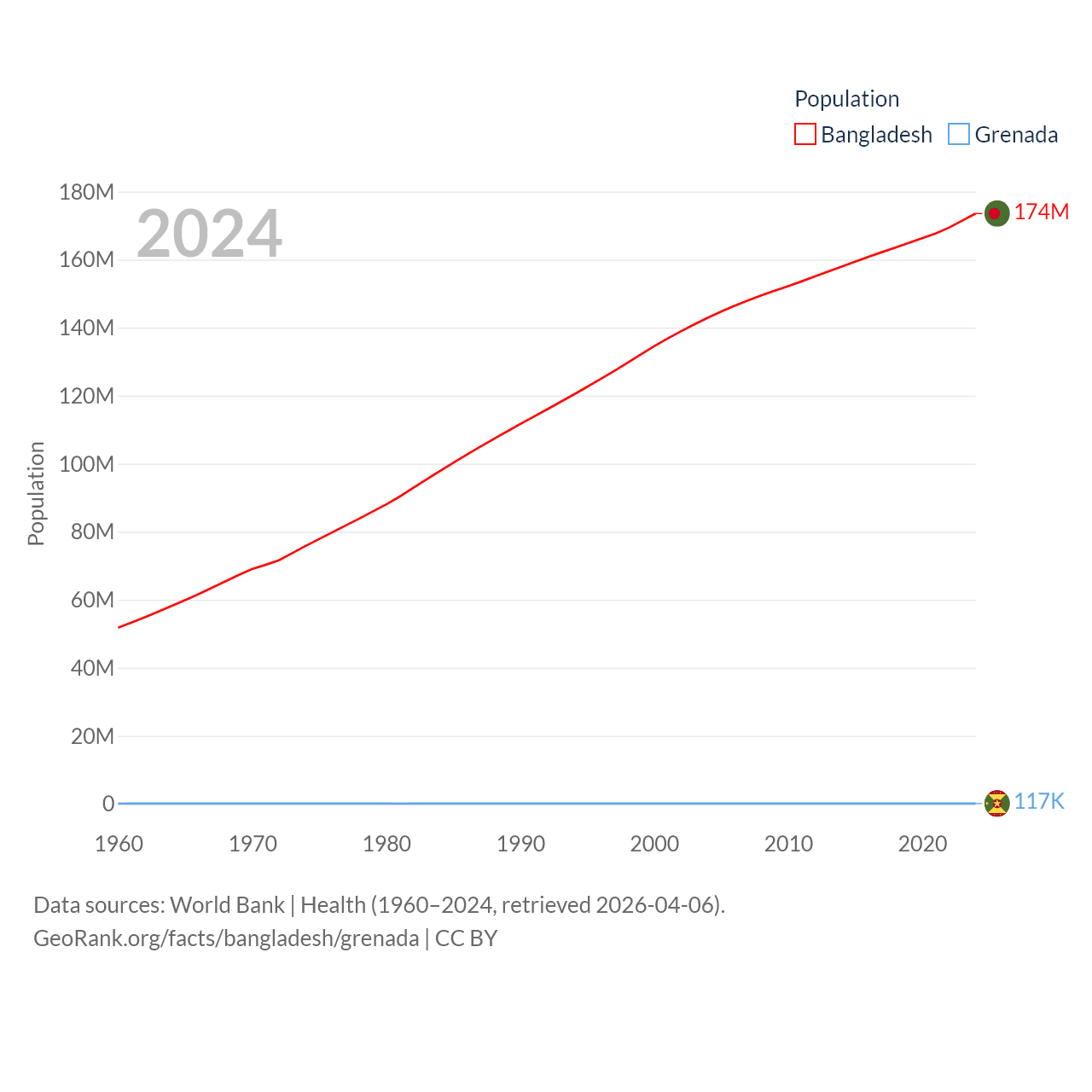 Bangladesh has a population of 174M (ranked 8/197), compared with 117K in Grenada (ranked 182/197). Bangladesh's land area is 50,186 sq mi versus 131.3 sq mi for Grenada (ranked 94th vs. 186th).