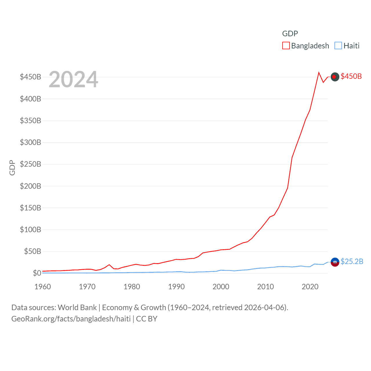 By GDP, Bangladesh ranks 36/197 ($450B) and Haiti ranks 117/197 ($25.2B). By GDP per capita, Bangladesh ranks 146/197 ($2,593), while Haiti ranks 153/197 ($2,143).