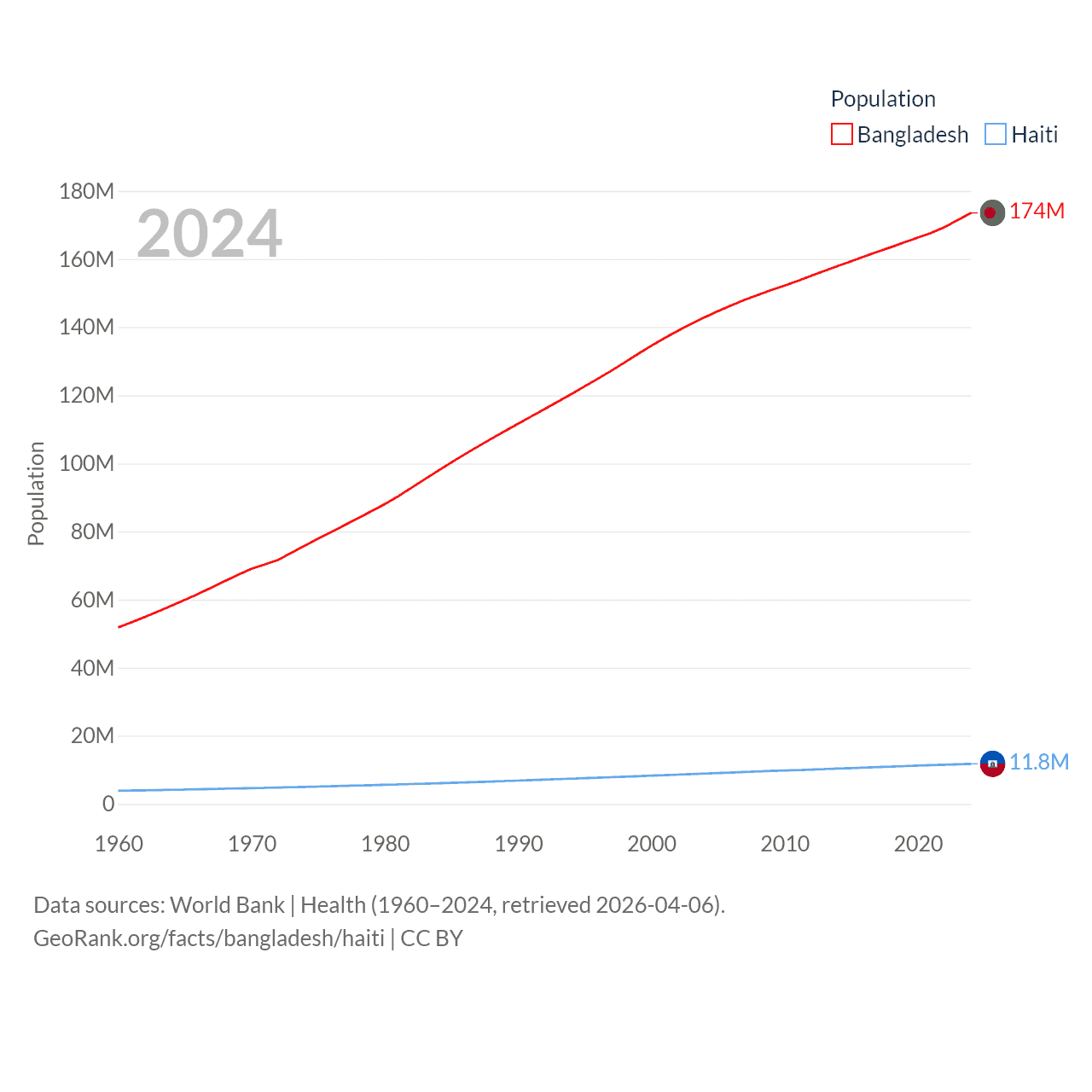 Bangladesh has a population of 174M (ranked 8/197), compared with 11.8M in Haiti (ranked 83/197). Bangladesh's land area is 50,186 sq mi versus 10,641 sq mi for Haiti (ranked 94th vs. 142nd).