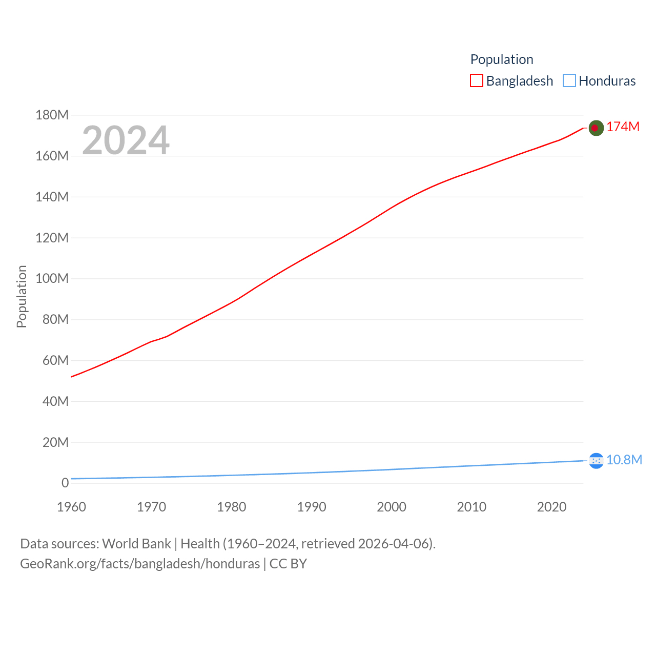 Bangladesh has a population of 174M (ranked 8/197), compared with 10.8M in Honduras (ranked 89/197). Bangladesh's land area is 50,186 sq mi versus 43,201 sq mi for Honduras (ranked 94th vs. 100th).