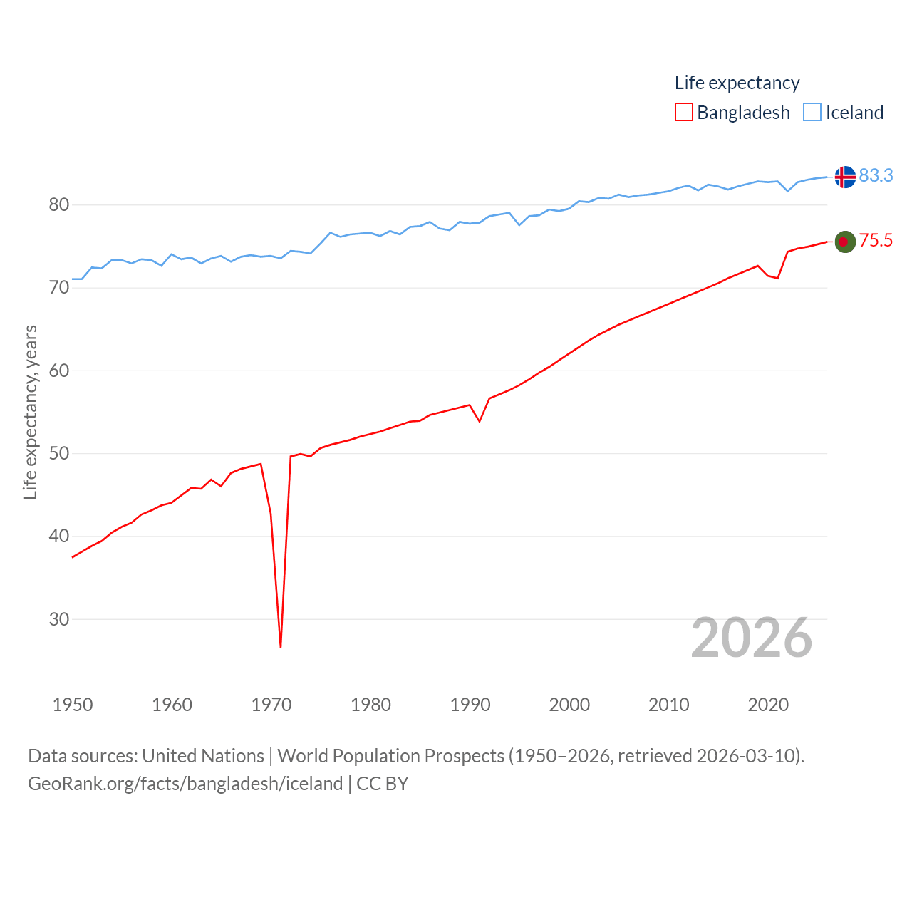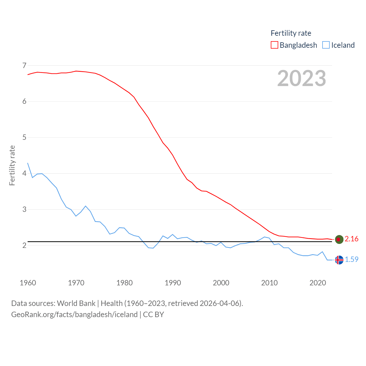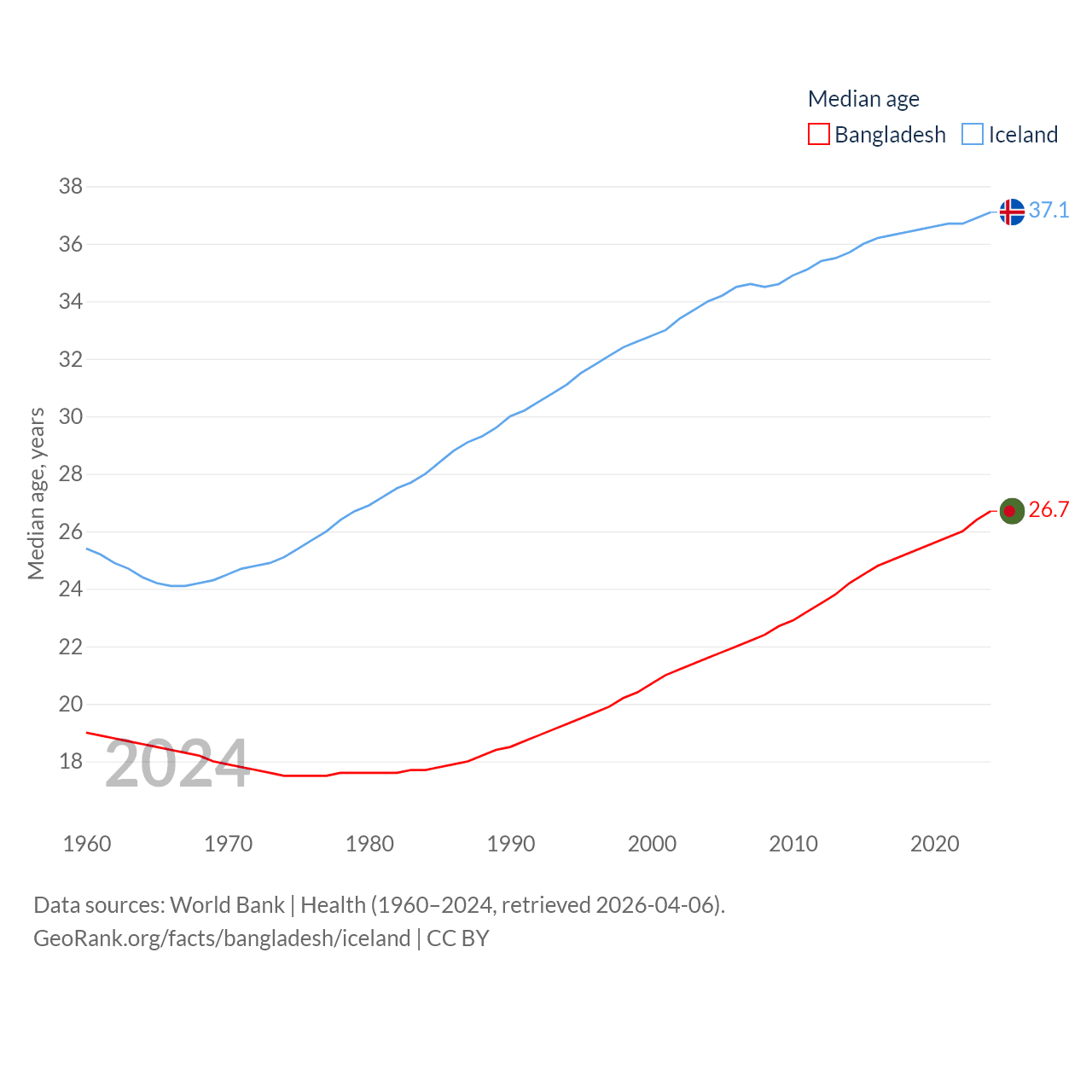Bangladesh has a population of 174M (ranked 8/197), compared with 387K in Iceland (ranked 173/197). Bangladesh's land area is 50,186 sq mi versus 38,931 sq mi for Iceland (ranked 94th vs. 104th).