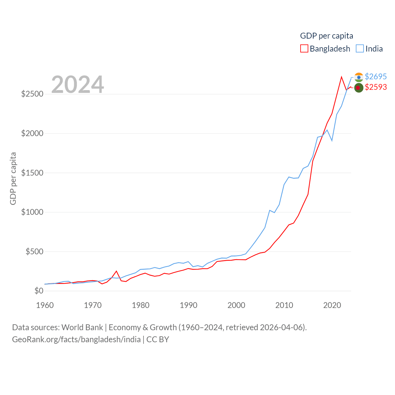By GDP, Bangladesh ranks 36/197 ($450B) and India ranks 5/197 ($3.91T). By GDP per capita, Bangladesh ranks 146/197 ($2,593), while India ranks 143/197 ($2,695).