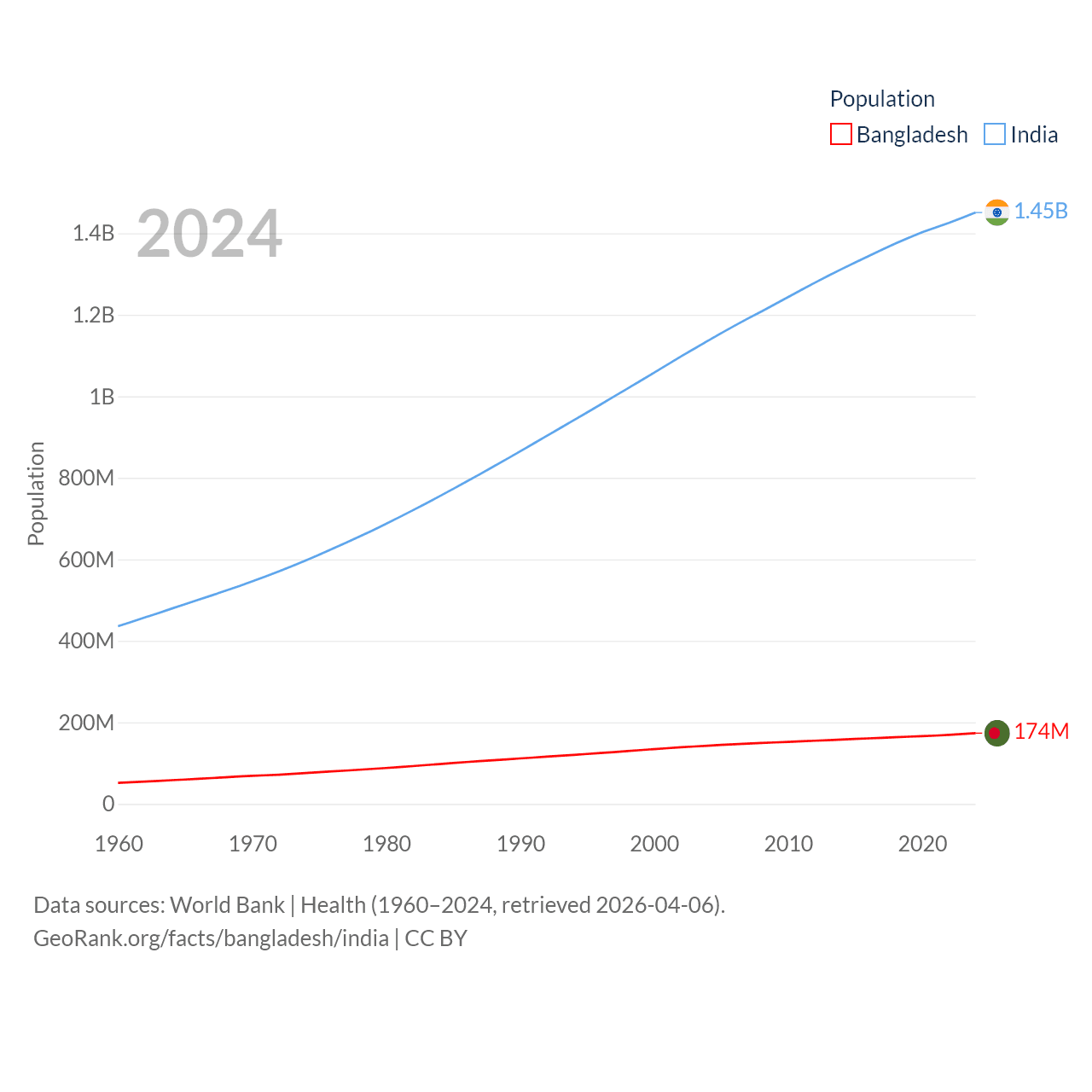 Bangladesh has a population of 174M (ranked 8/197), compared with 1.45B in India (ranked 1/197). Bangladesh's land area is 50,186 sq mi versus 1,147,955 sq mi for India (ranked 94th vs. 7th).