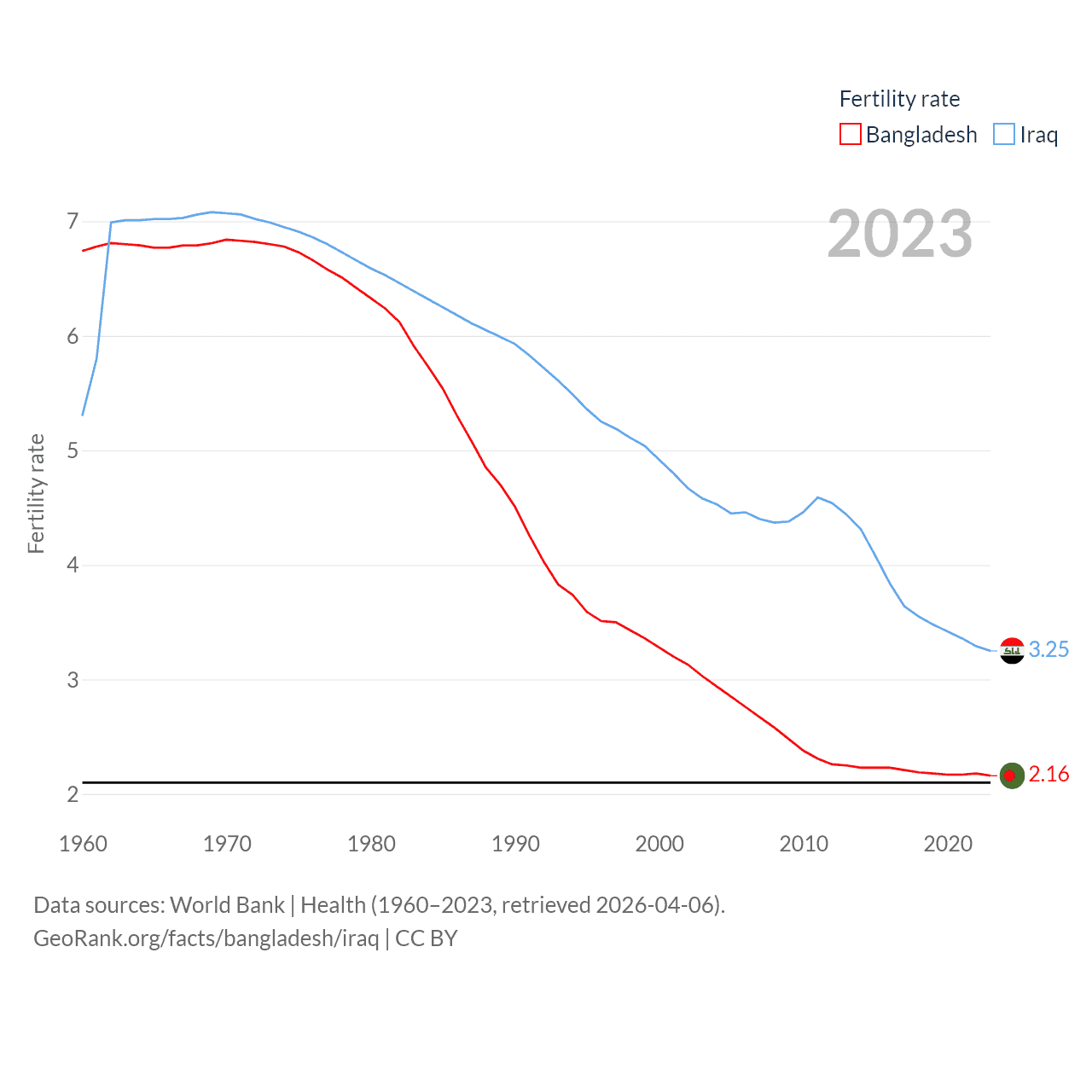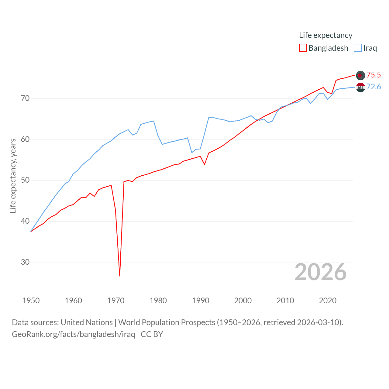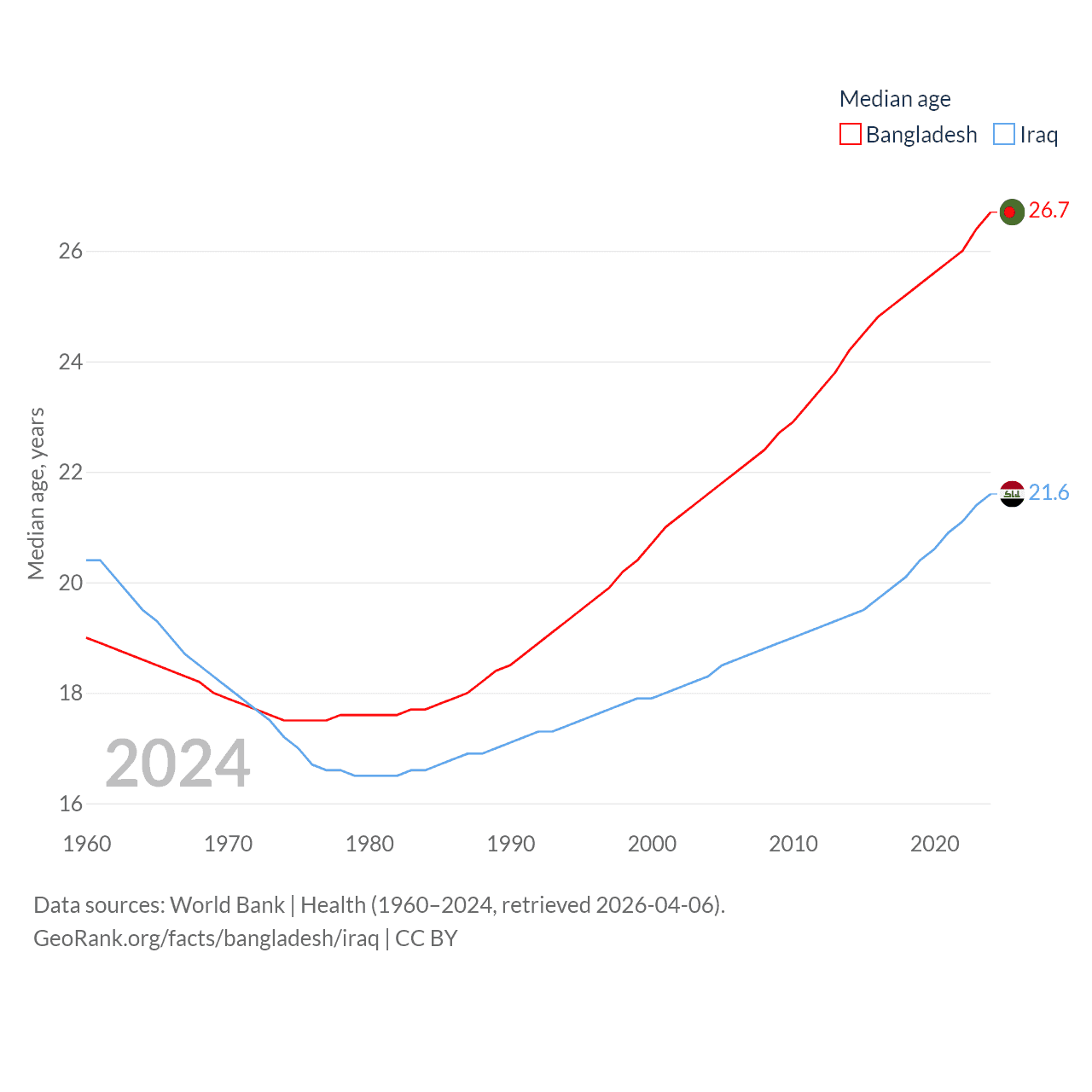 Bangladesh has a population of 174M (ranked 8/197), compared with 46M in Iraq (ranked 34/197). Bangladesh's land area is 50,186 sq mi versus 167,619 sq mi for Iraq (ranked 94th vs. 57th).