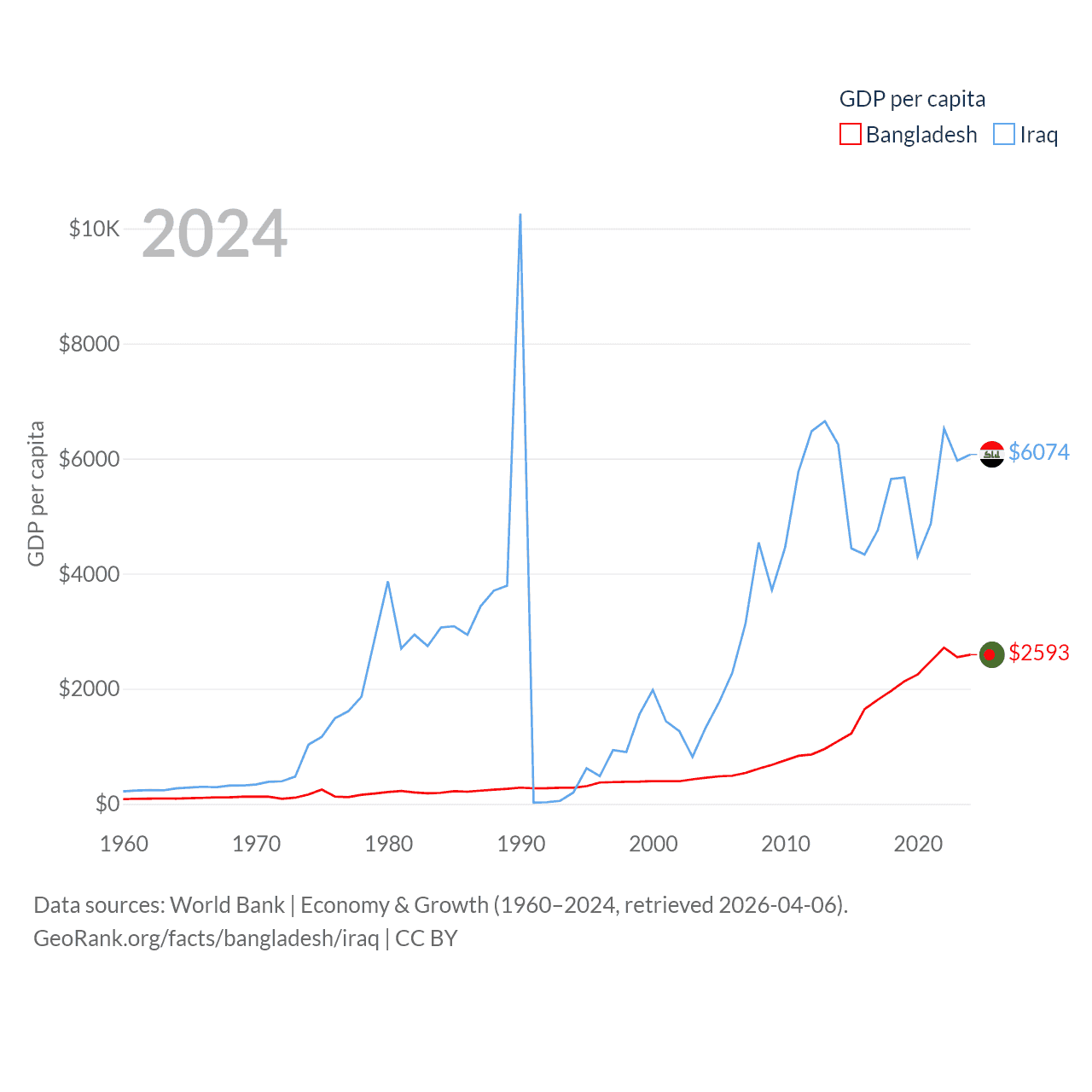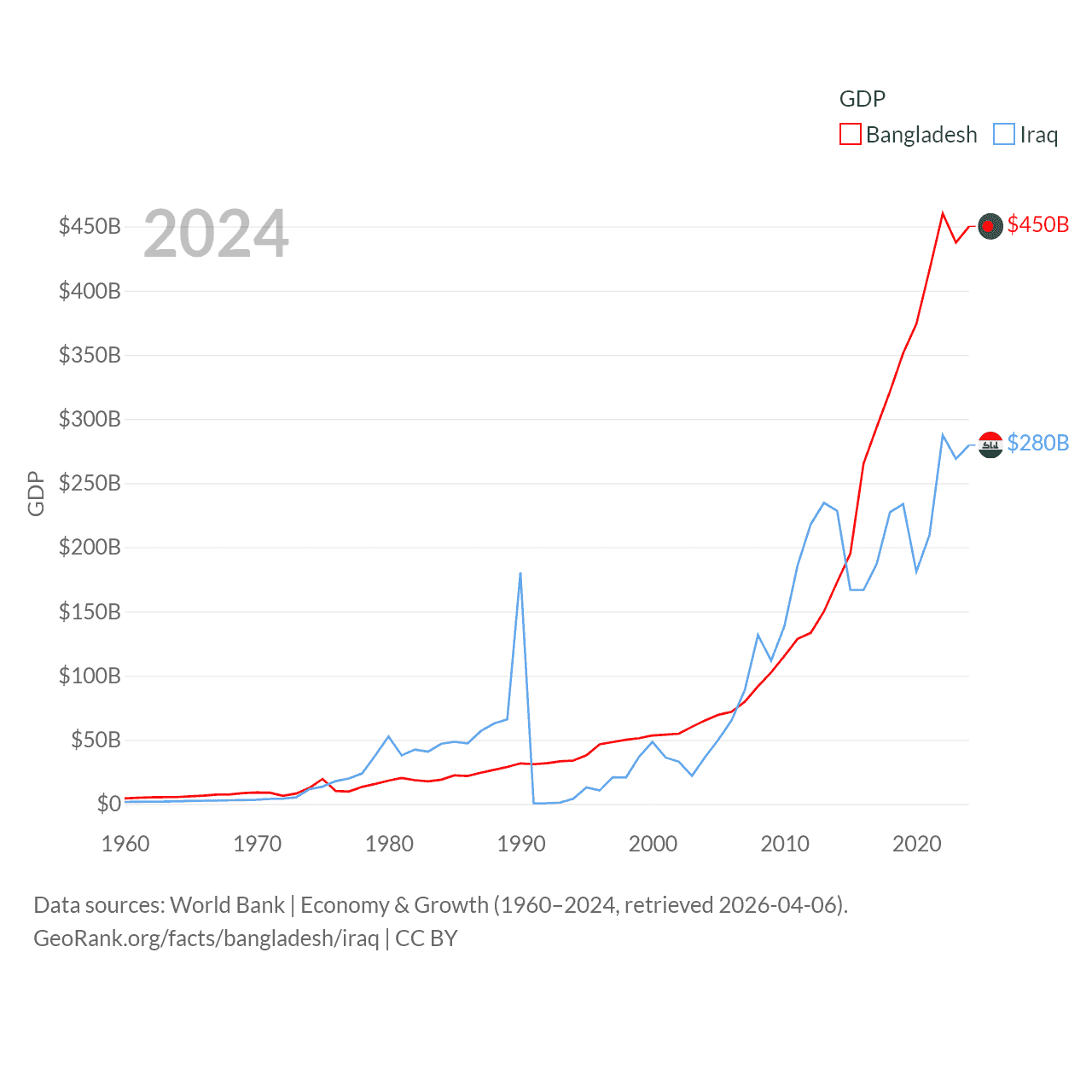 By GDP, Bangladesh ranks 36/197 ($450B) and Iraq ranks 50/197 ($280B). By GDP per capita, Bangladesh ranks 146/197 ($2,593), while Iraq ranks 113/197 ($6,074).