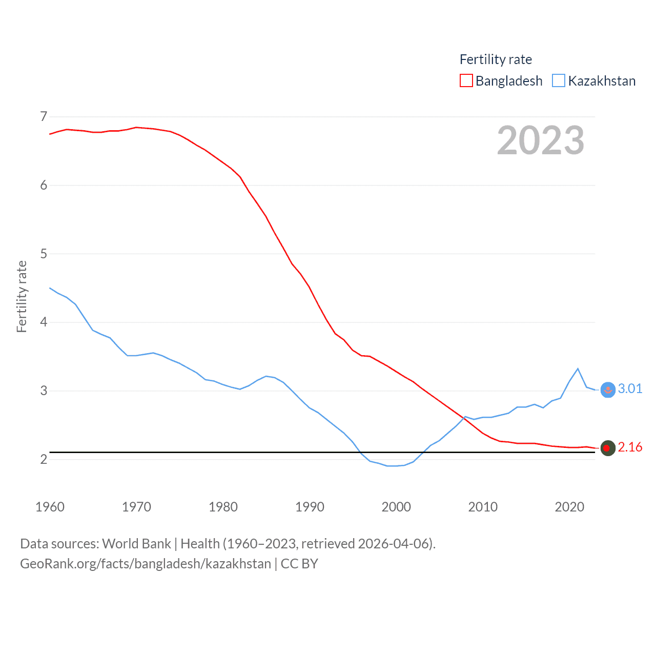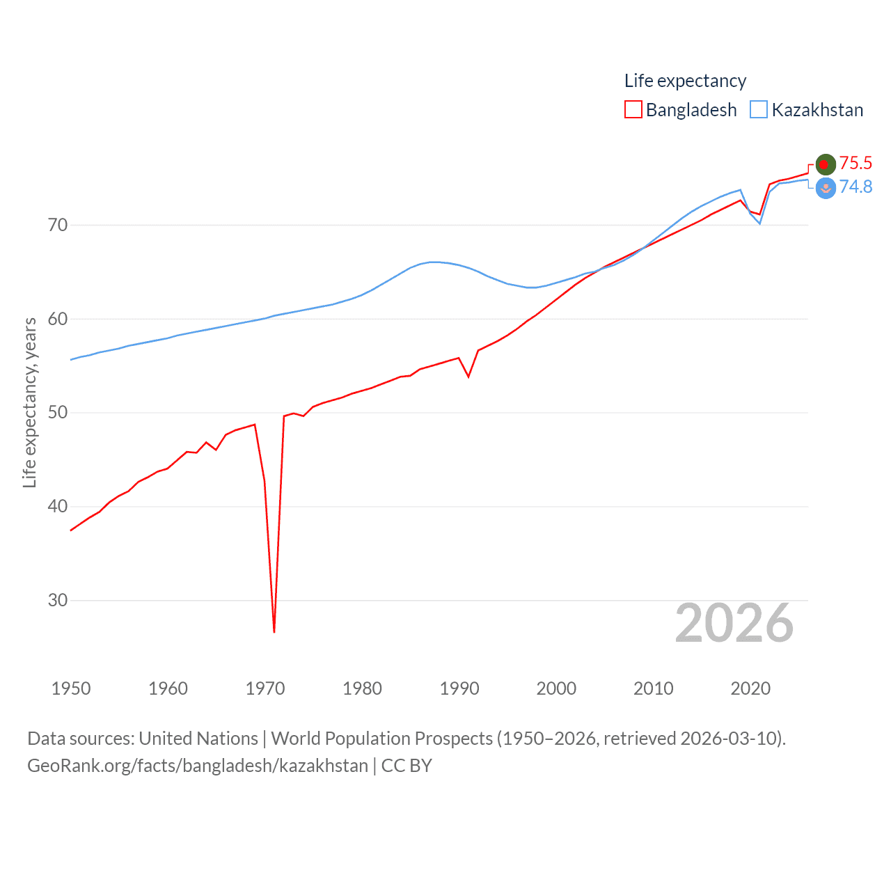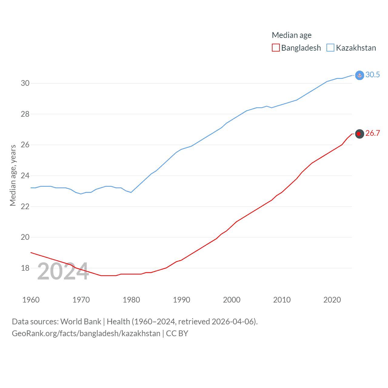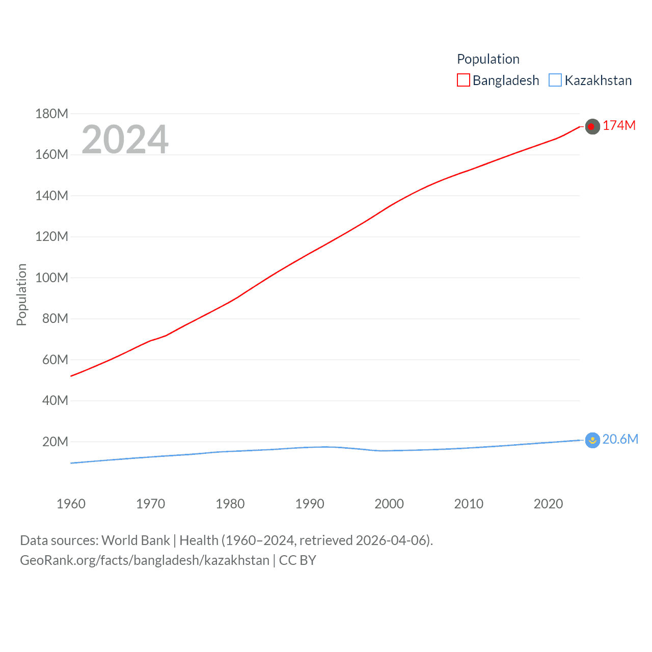 Bangladesh has a population of 174M (ranked 8/197), compared with 20.6M in Kazakhstan (ranked 64/197). Bangladesh's land area is 50,186 sq mi versus 1,042,360 sq mi for Kazakhstan (ranked 94th vs. 9th).