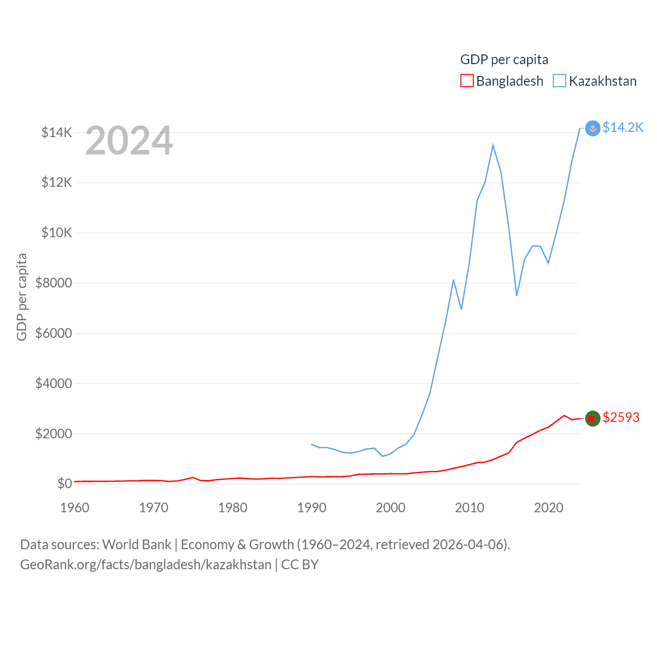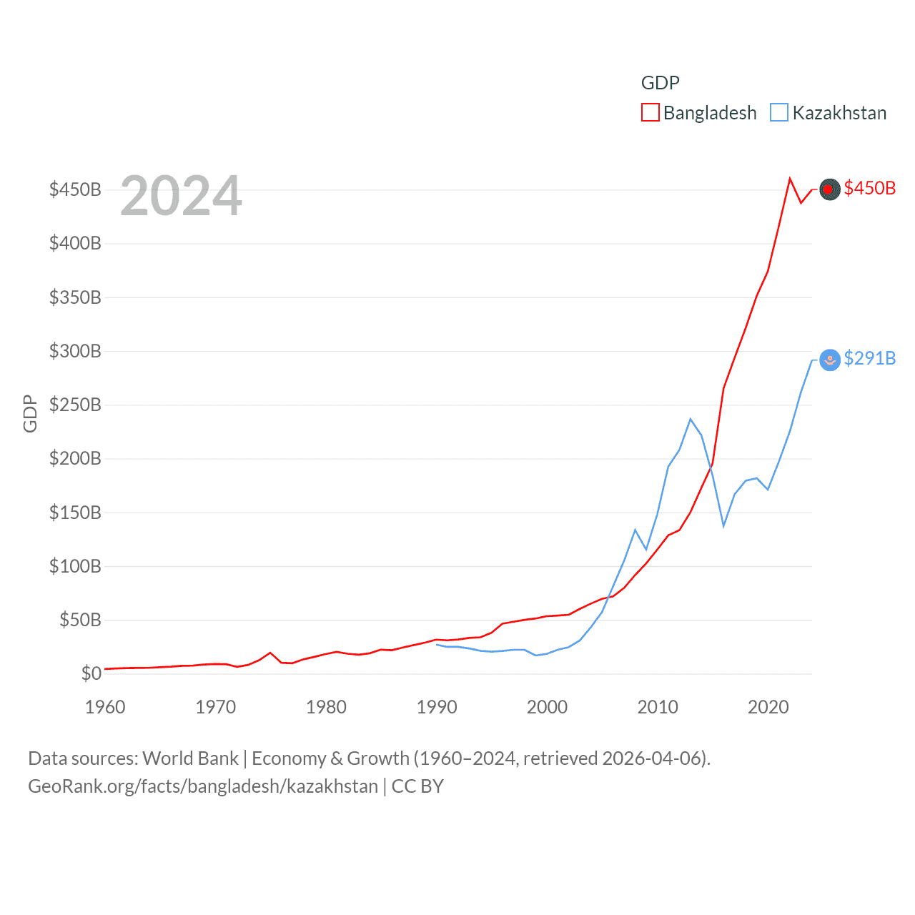 By GDP, Bangladesh ranks 36/197 ($450B) and Kazakhstan ranks 48/197 ($291B). By GDP per capita, Bangladesh ranks 146/197 ($2,593), while Kazakhstan ranks 71/197 ($14,155).