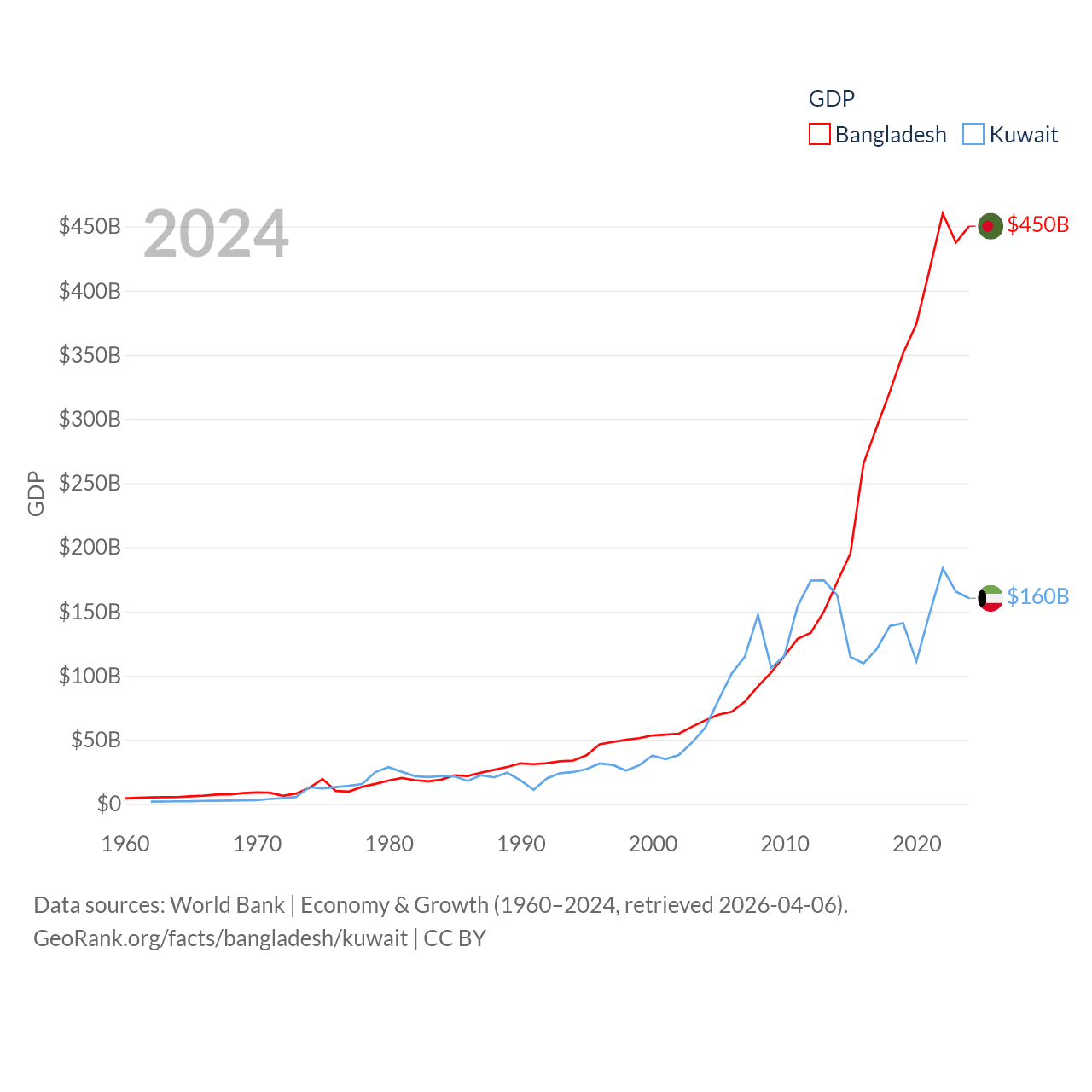 By GDP, Bangladesh ranks 36/197 ($450B) and Kuwait ranks 59/197 ($160B). By GDP per capita, Bangladesh ranks 146/197 ($2,593), while Kuwait ranks 37/197 ($32,718).