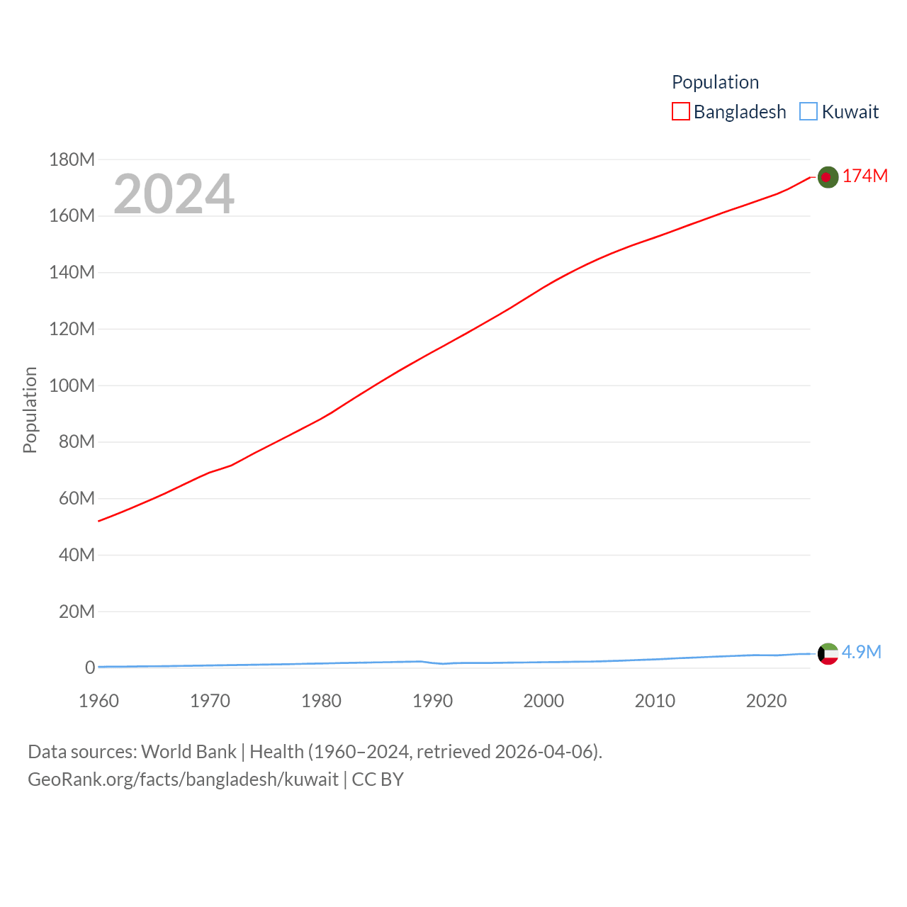 Bangladesh has a population of 174M (ranked 8/197), compared with 4.9M in Kuwait (ranked 127/197). Bangladesh's land area is 50,186 sq mi versus 6,880 sq mi for Kuwait (ranked 94th vs. 153rd).