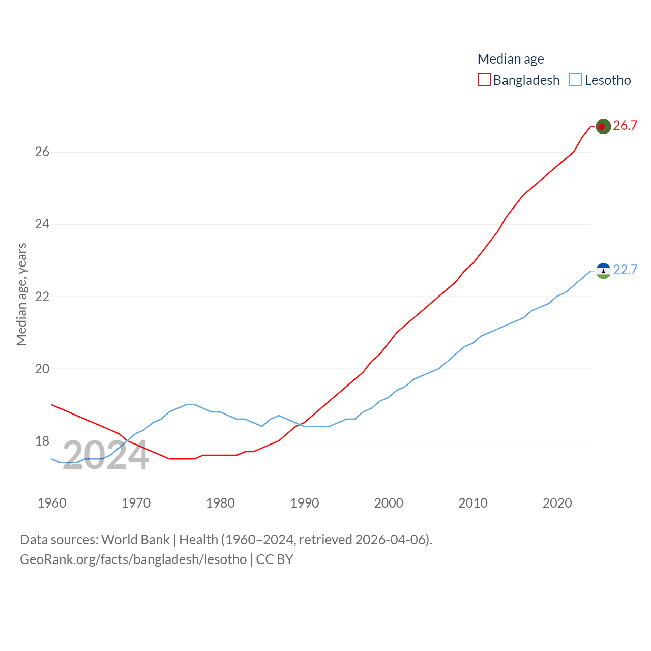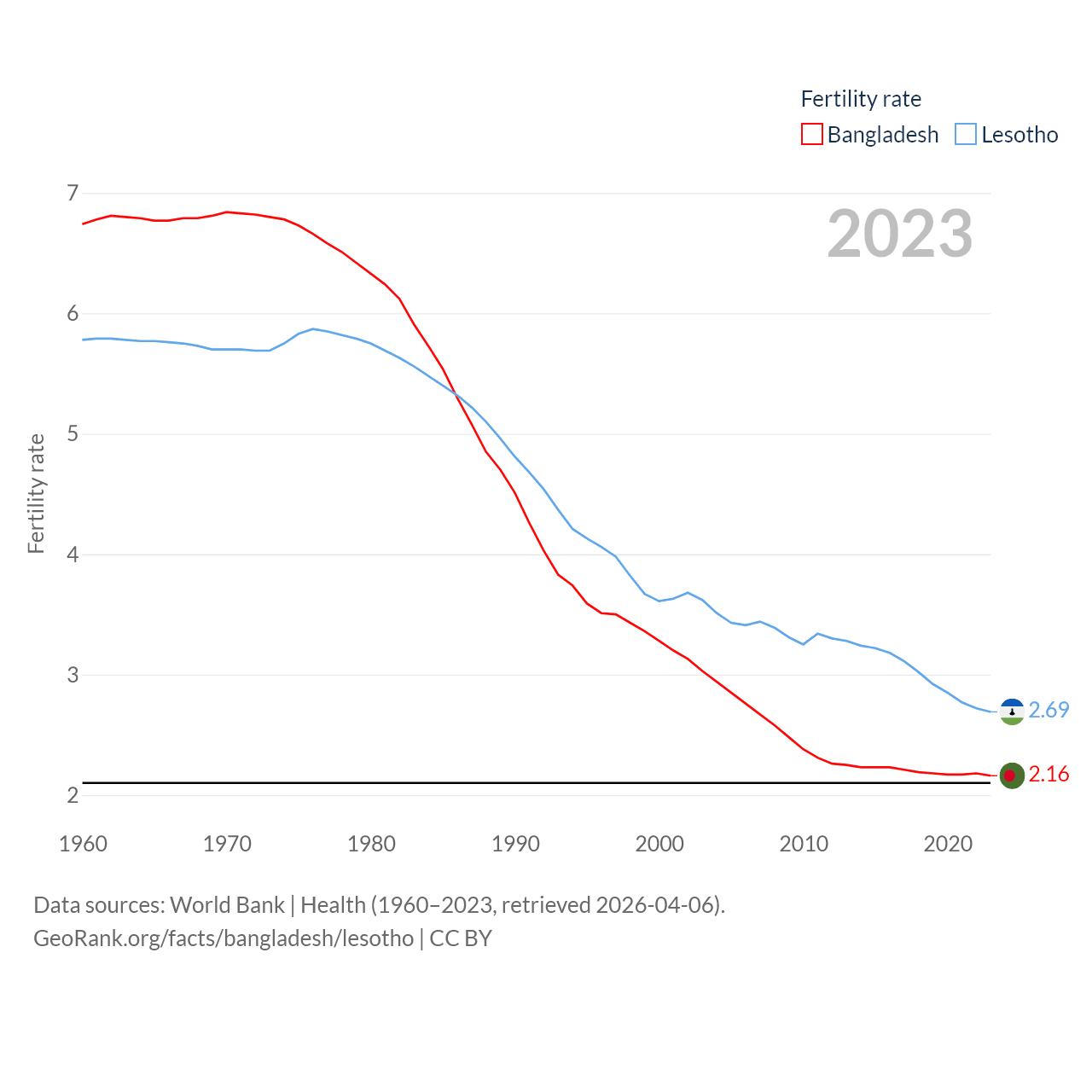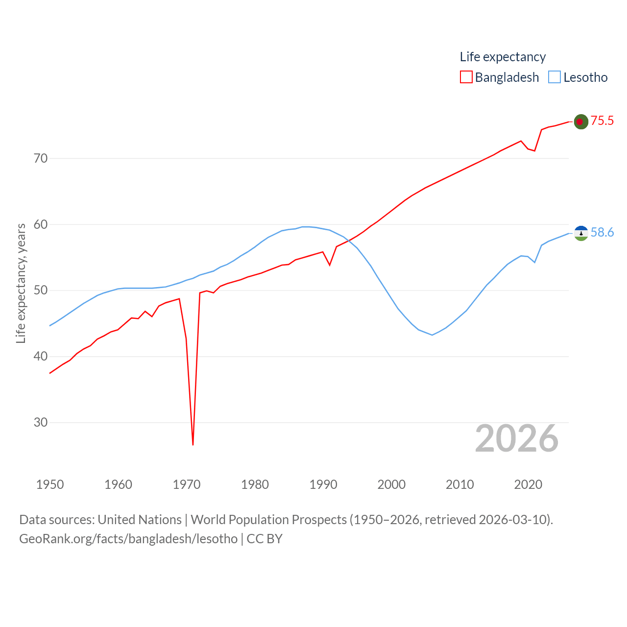 Bangladesh has a population of 174M (ranked 8/197), compared with 2.34M in Lesotho (ranked 145/197). Bangladesh's land area is 50,186 sq mi versus 11,722 sq mi for Lesotho (ranked 94th vs. 137th).