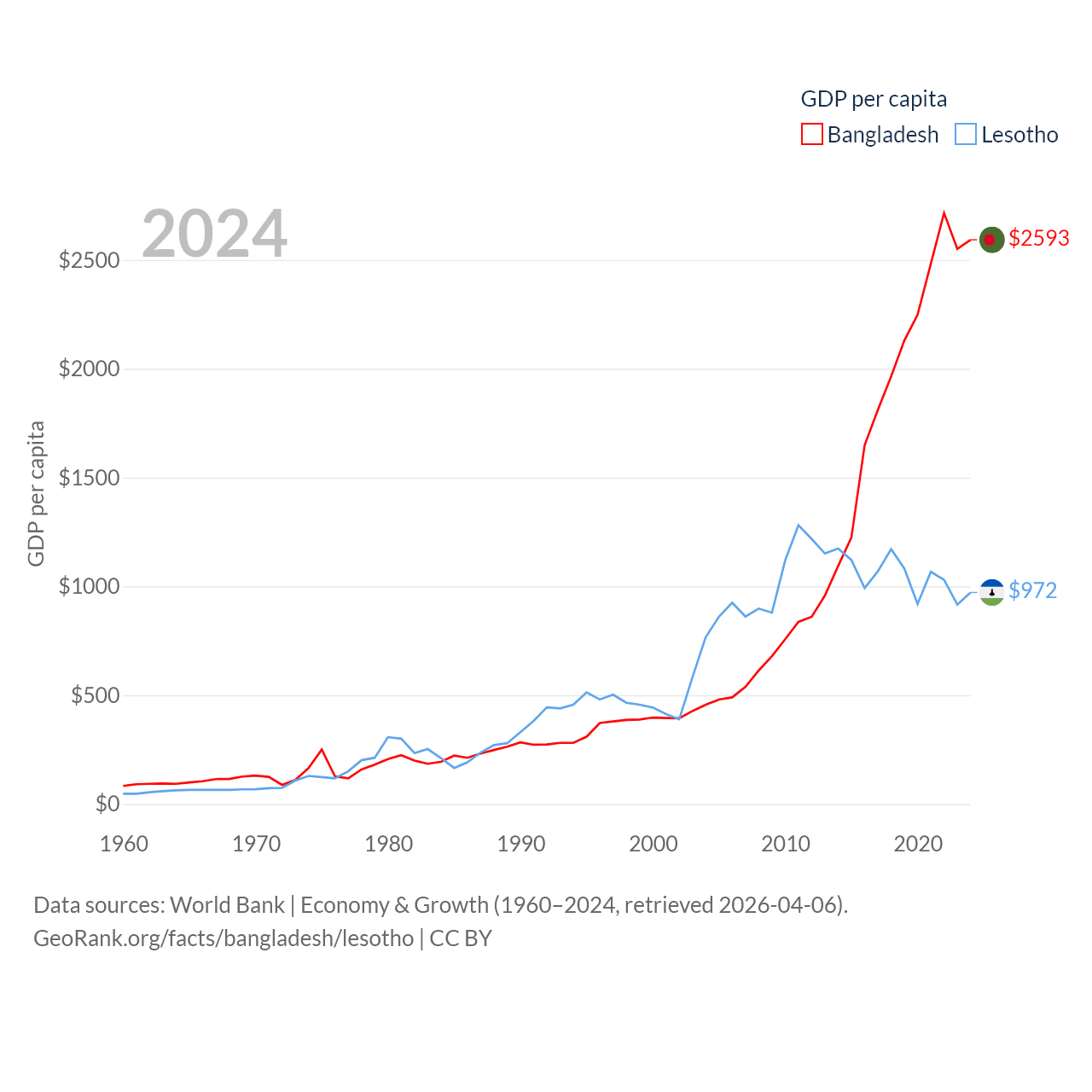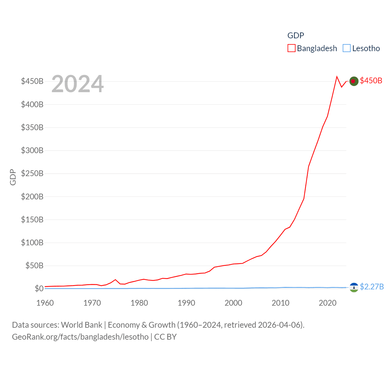 By GDP, Bangladesh ranks 36/197 ($450B) and Lesotho ranks 175/197 ($2.27B). By GDP per capita, Bangladesh ranks 146/197 ($2,593), while Lesotho ranks 181/197 ($972).