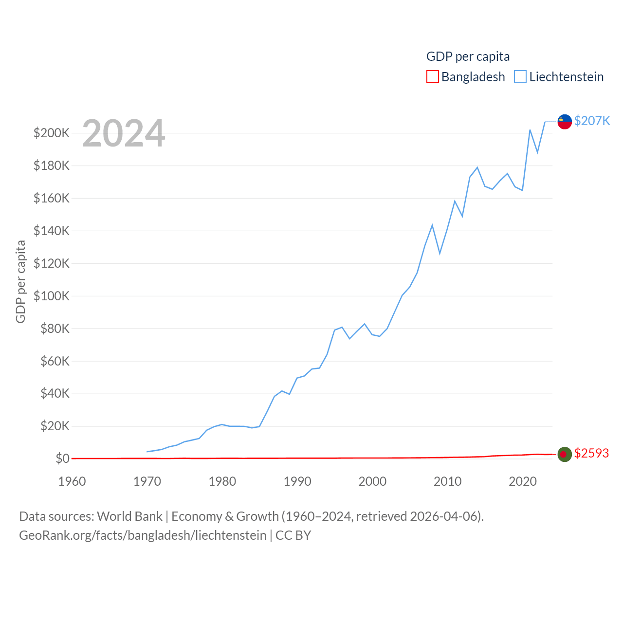 By GDP, Bangladesh ranks 36/197 ($450B) and Liechtenstein ranks 156/197 ($8.24B). By GDP per capita, Bangladesh ranks 146/197 ($2,593), while Liechtenstein ranks 2/197 ($206,781).