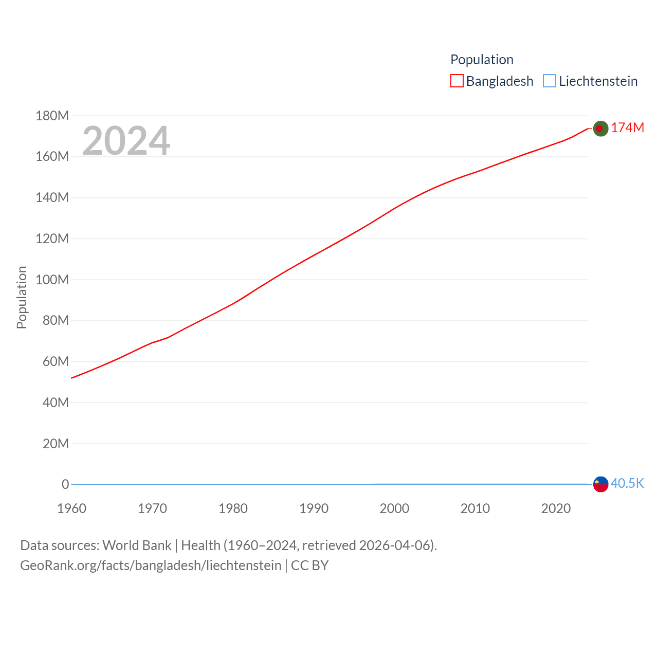 Bangladesh has a population of 174M (ranked 8/197), compared with 40.4K in Liechtenstein (ranked 190/197). Bangladesh's land area is 50,186 sq mi versus 61.8 sq mi for Liechtenstein (ranked 94th vs. 192nd).