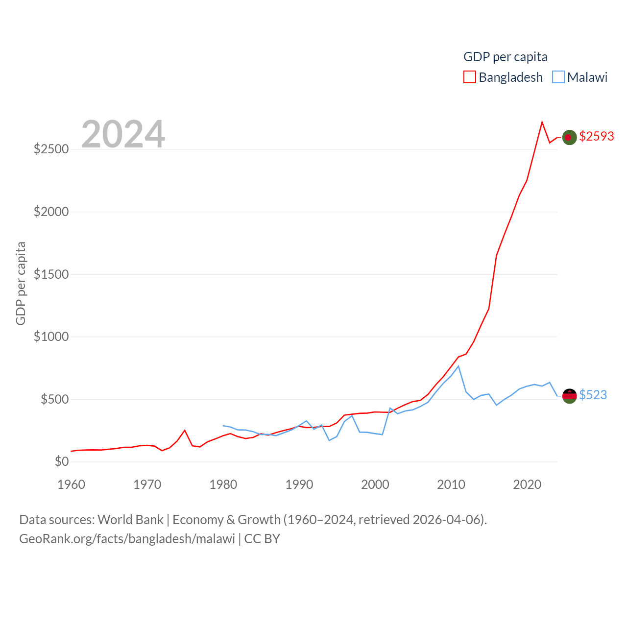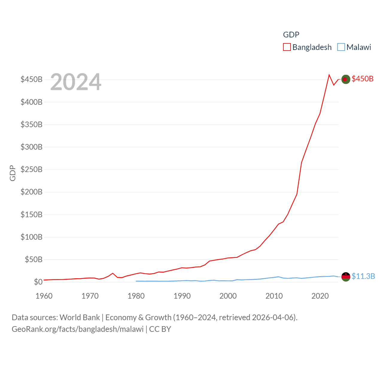 By GDP, Bangladesh ranks 36/197 ($450B) and Malawi ranks 151/197 ($11.3B). By GDP per capita, Bangladesh ranks 146/197 ($2,593), while Malawi ranks 194/197 ($523).