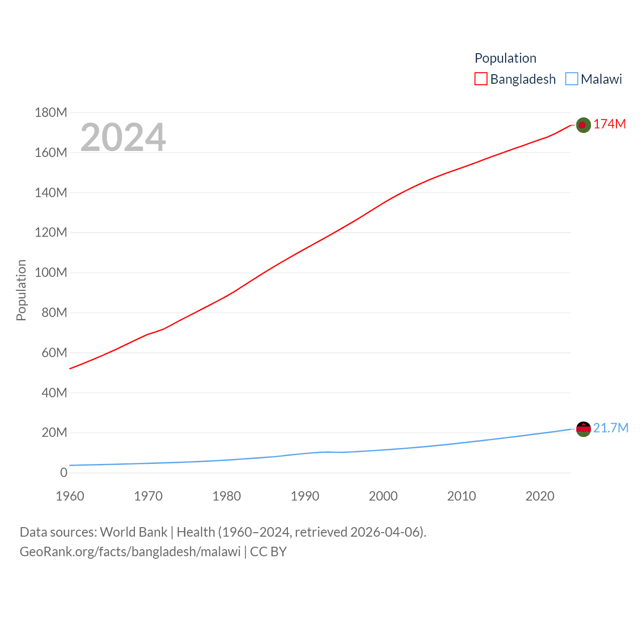Bangladesh has a population of 174M (ranked 8/197), compared with 21.7M in Malawi (ranked 62/197). Bangladesh's land area is 50,186 sq mi versus 36,402 sq mi for Malawi (ranked 94th vs. 107th).