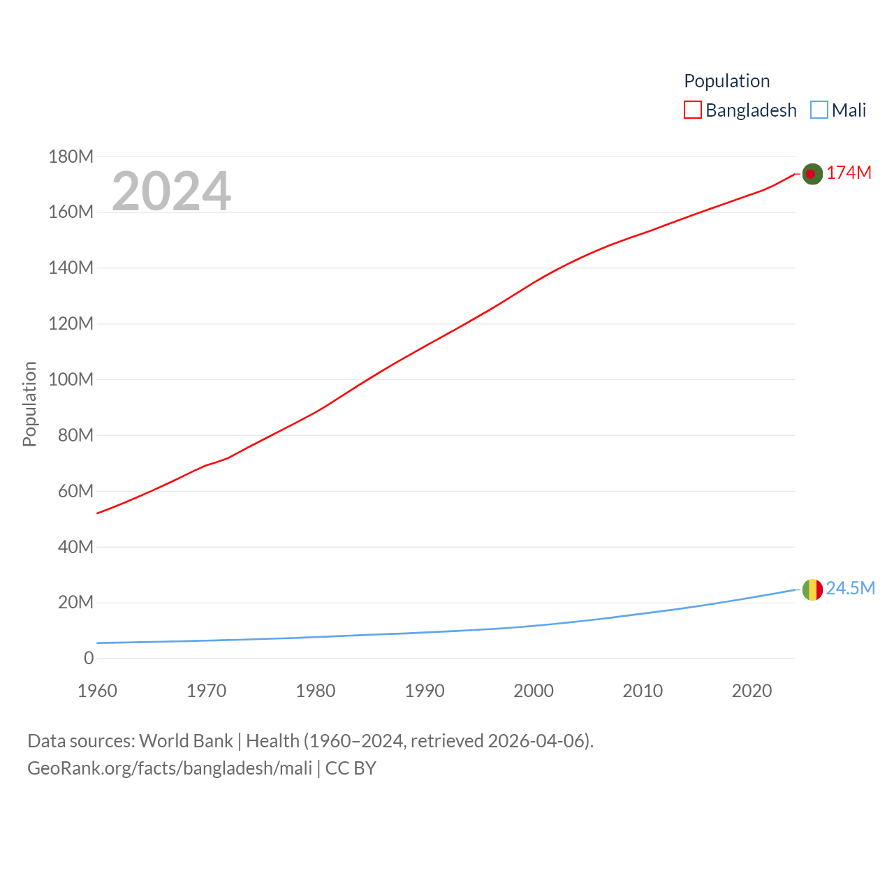 Bangladesh has a population of 174M (ranked 8/197), compared with 24.5M in Mali (ranked 58/197). Bangladesh's land area is 50,186 sq mi versus 471,118 sq mi for Mali (ranked 94th vs. 23rd).