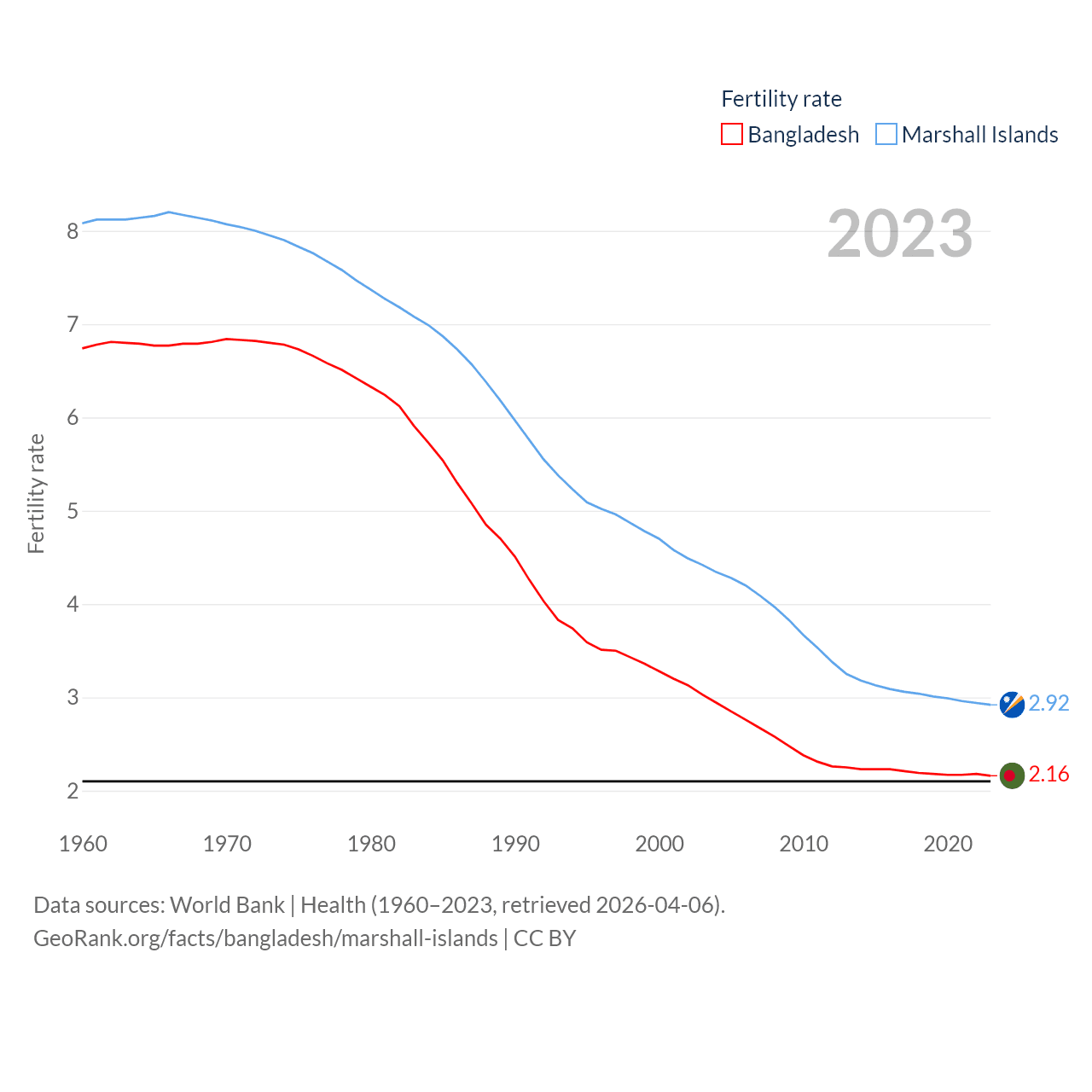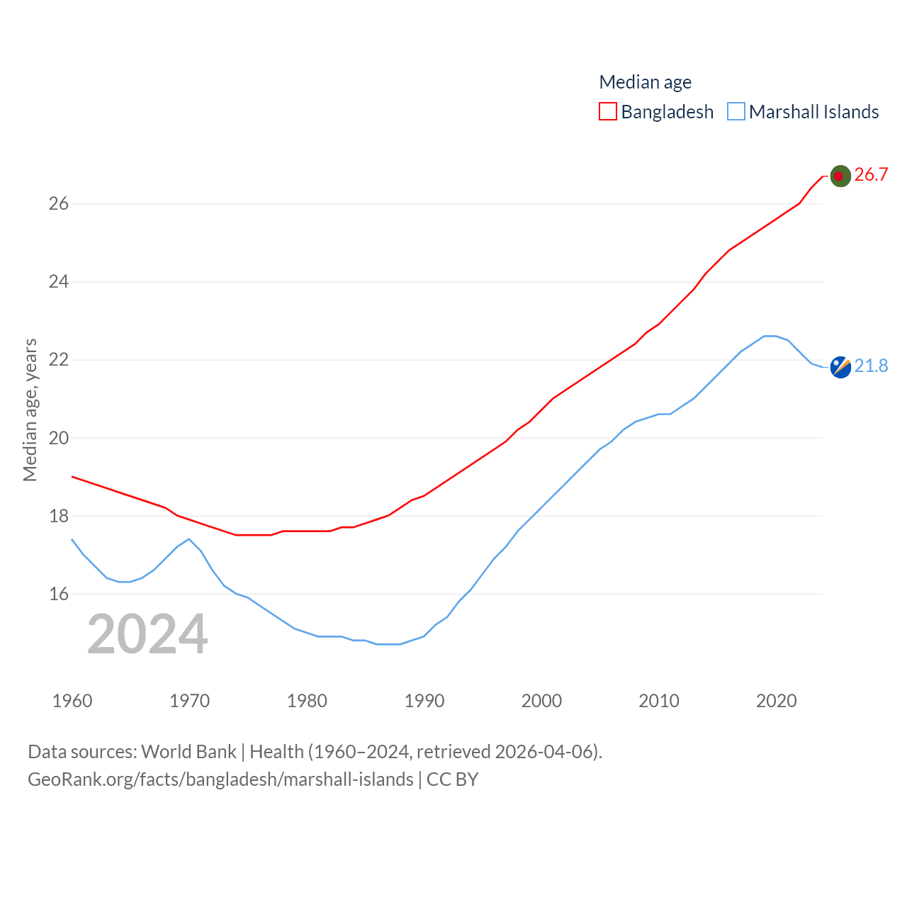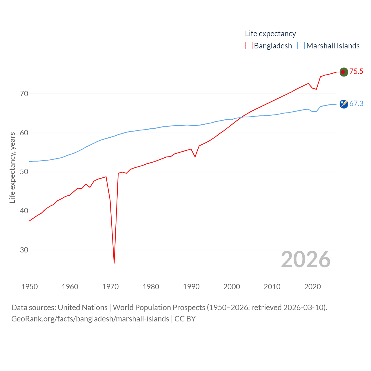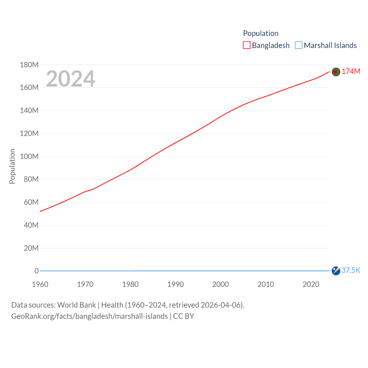 Bangladesh has a population of 174M (ranked 8/197), compared with 37.5K in The Marshall Islands (ranked 192/197). Bangladesh's land area is 50,186 sq mi versus 69.5 sq mi for The Marshall Islands (ranked 94th vs. 191st).