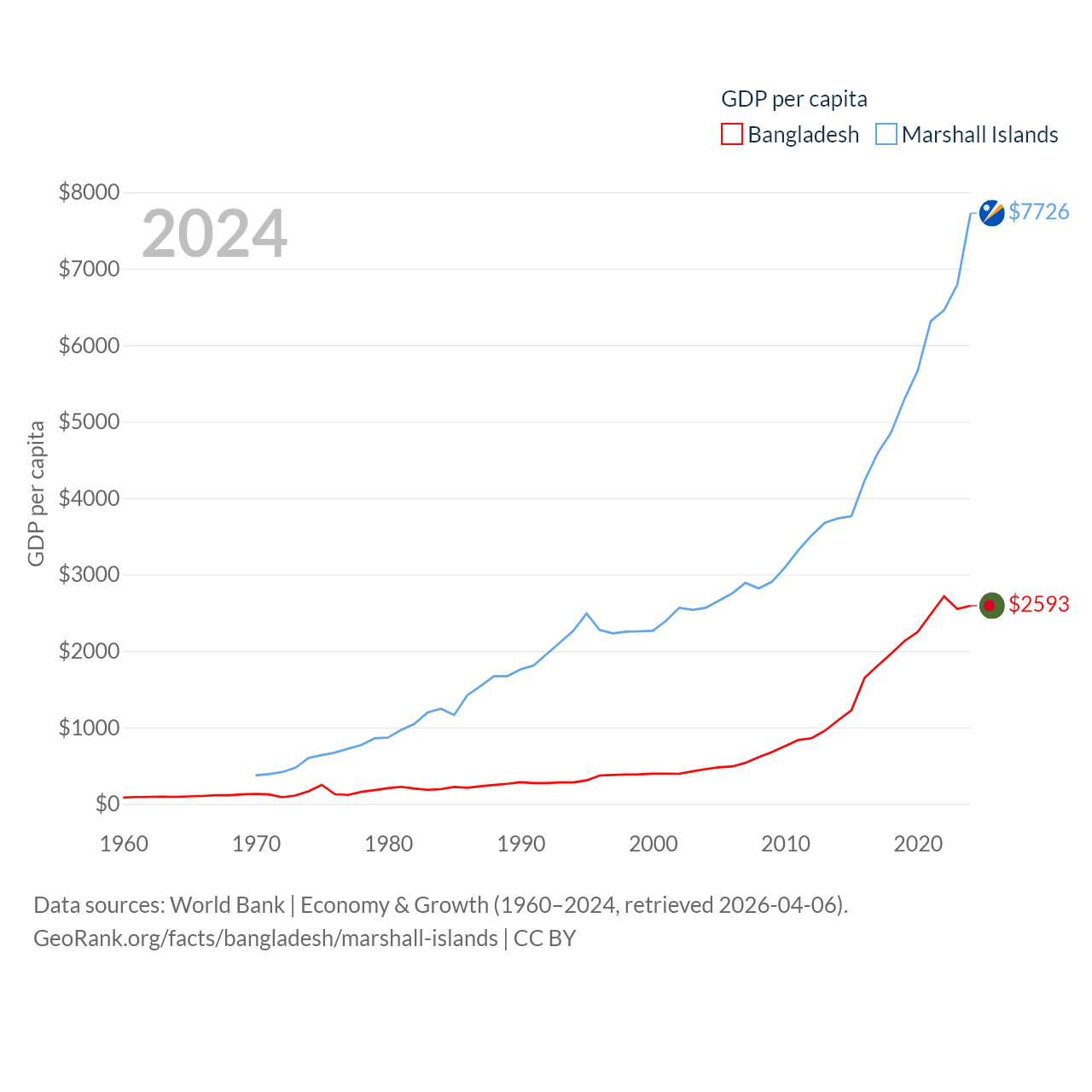 By GDP, Bangladesh ranks 36/197 ($450B) and The Marshall Islands ranks 193/197 ($290M). By GDP per capita, Bangladesh ranks 146/197 ($2,593), while The Marshall Islands ranks 96/197 ($7,726).