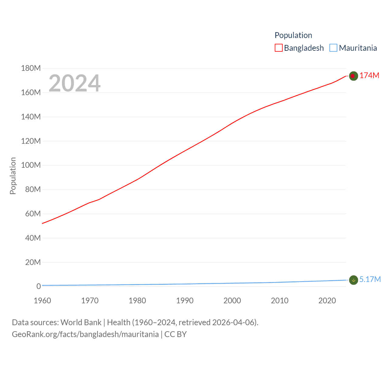 Bangladesh has a population of 174M (ranked 8/197), compared with 5.17M in Mauritania (ranked 125/197). Bangladesh's land area is 50,186 sq mi versus 397,955 sq mi for Mauritania (ranked 94th vs. 28th).