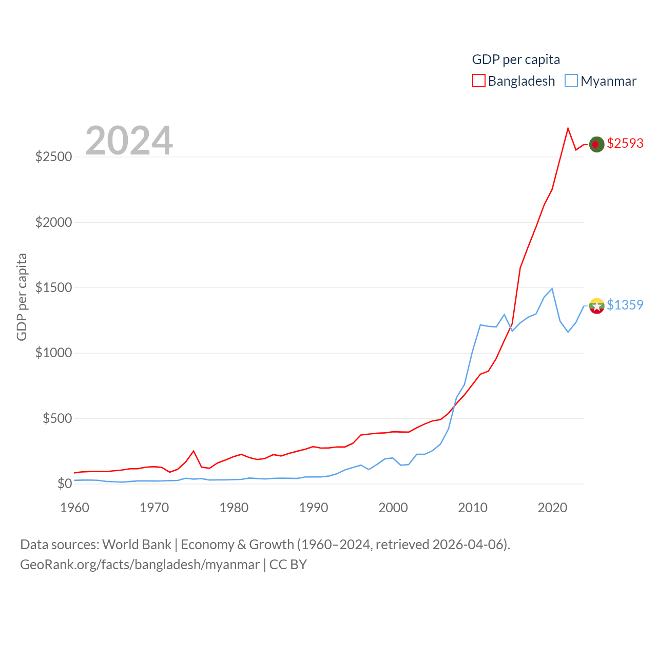 By GDP, Bangladesh ranks 36/197 ($450B) and Myanmar ranks 85/197 ($74.1B). By GDP per capita, Bangladesh ranks 146/197 ($2,593), while Myanmar ranks 165/197 ($1,359).