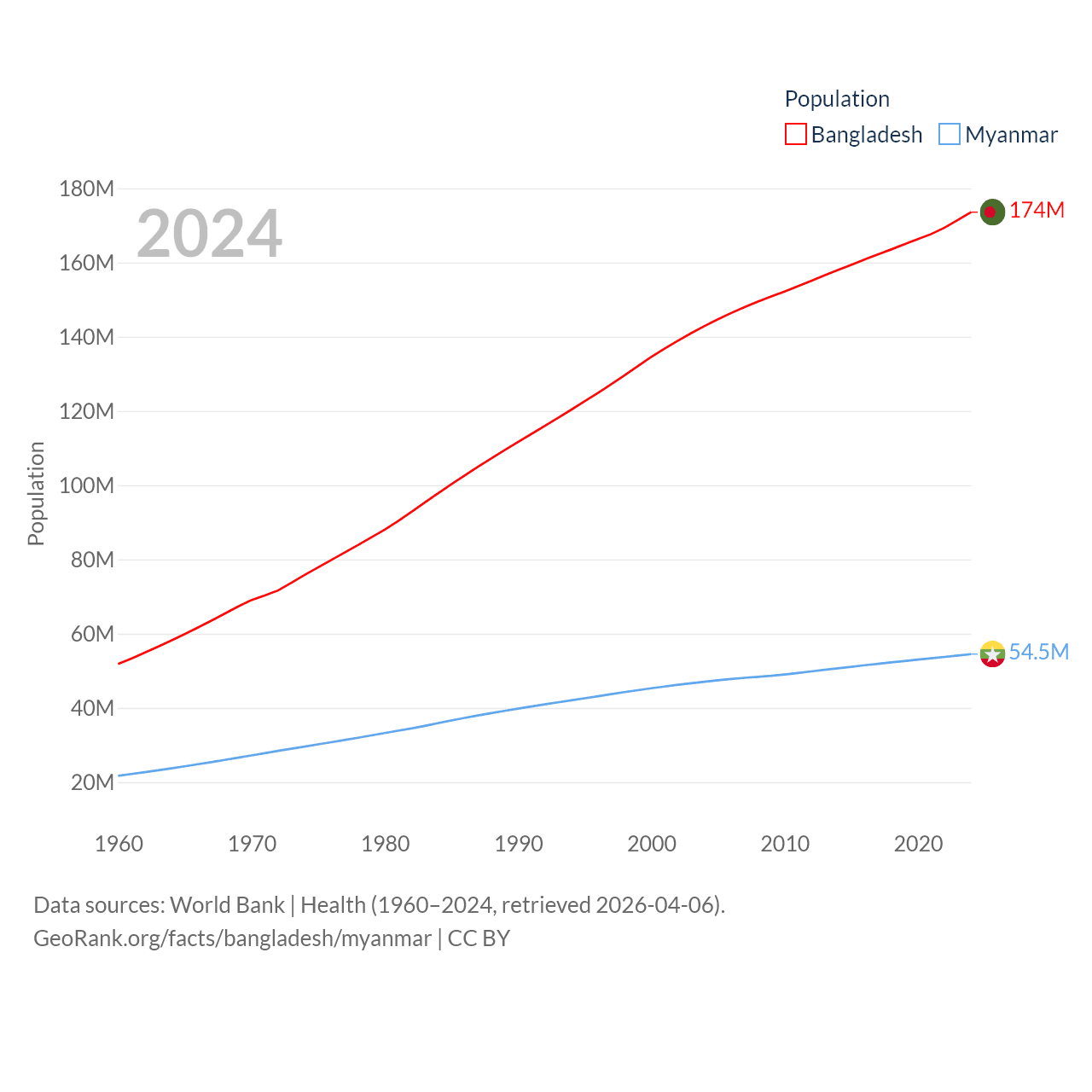 Bangladesh has a population of 174M (ranked 8/197), compared with 54.5M in Myanmar (ranked 27/197). Bangladesh's land area is 50,186 sq mi versus 251,997 sq mi for Myanmar (ranked 94th vs. 39th).