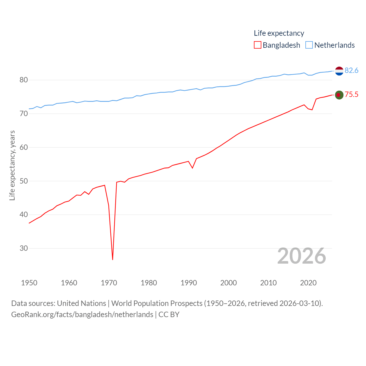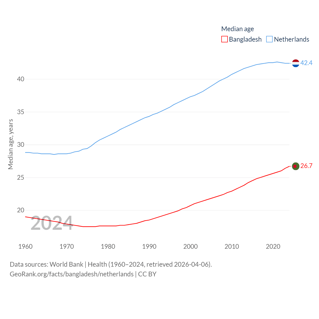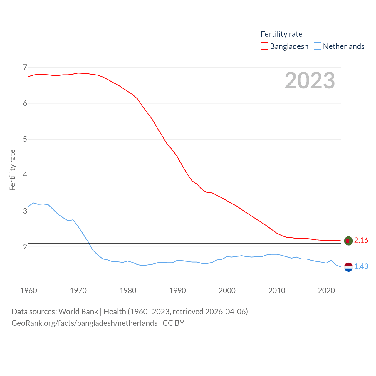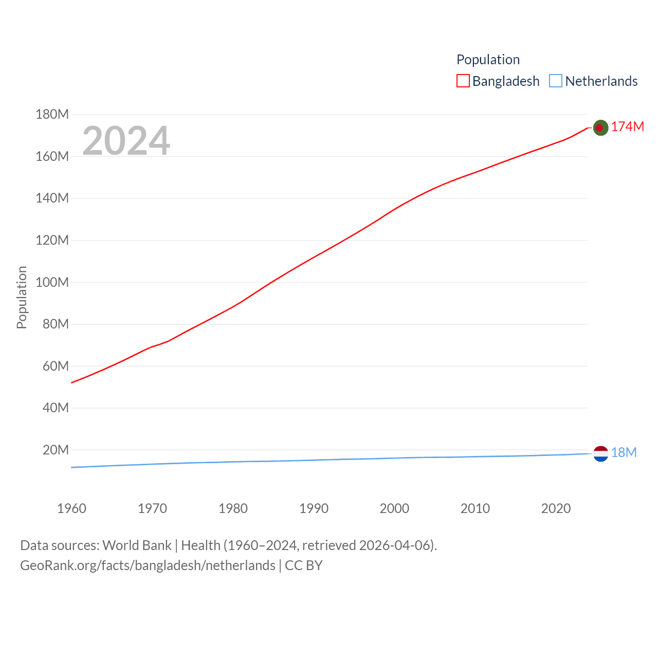 Bangladesh has a population of 174M (ranked 8/197), compared with 18M in The Netherlands (ranked 72/197). Bangladesh's land area is 50,186 sq mi versus 13,000 sq mi for The Netherlands (ranked 94th vs. 134th).