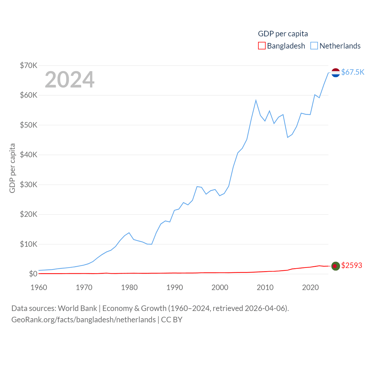 By GDP, Bangladesh ranks 36/197 ($450B) and The Netherlands ranks 19/197 ($1.21T). By GDP per capita, Bangladesh ranks 146/197 ($2,593), while The Netherlands ranks 13/197 ($67,520).
