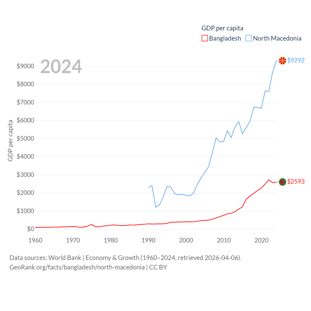 By GDP, Bangladesh ranks 36/197 ($450B) and North Macedonia ranks 138/197 ($17B). By GDP per capita, Bangladesh ranks 146/197 ($2,593), while North Macedonia ranks 88/197 ($9,292).