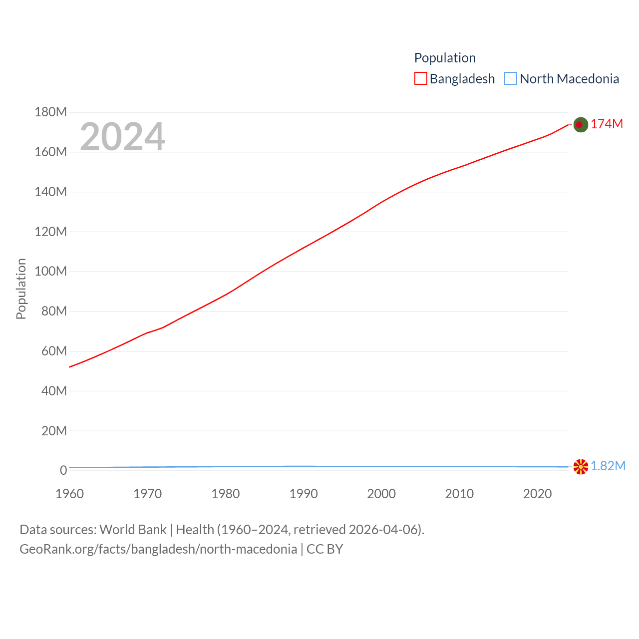 Bangladesh has a population of 174M (ranked 8/197), compared with 1.82M in North Macedonia (ranked 150/197). Bangladesh's land area is 50,186 sq mi versus 9,737 sq mi for North Macedonia (ranked 94th vs. 145th).