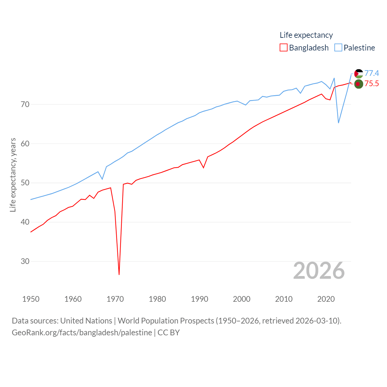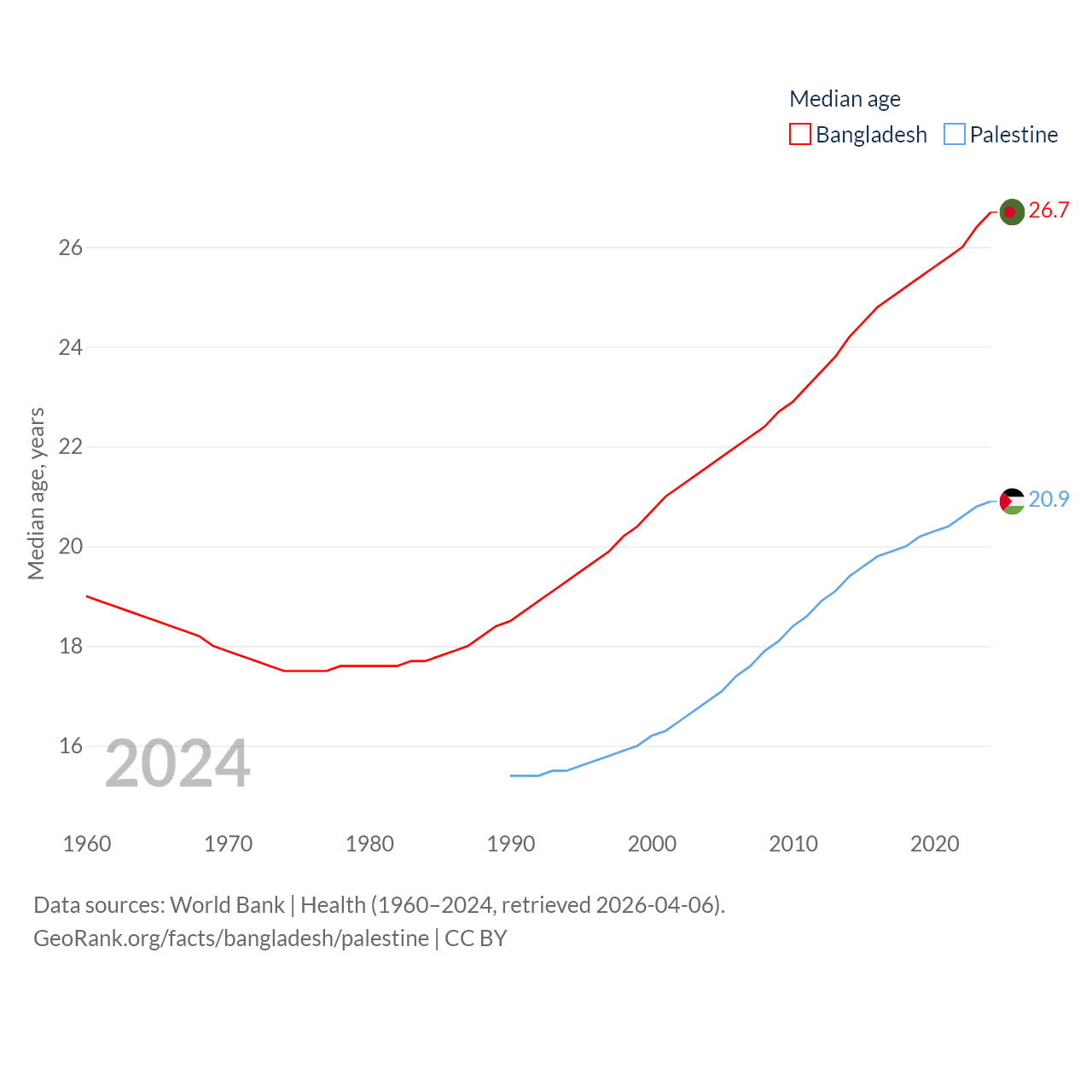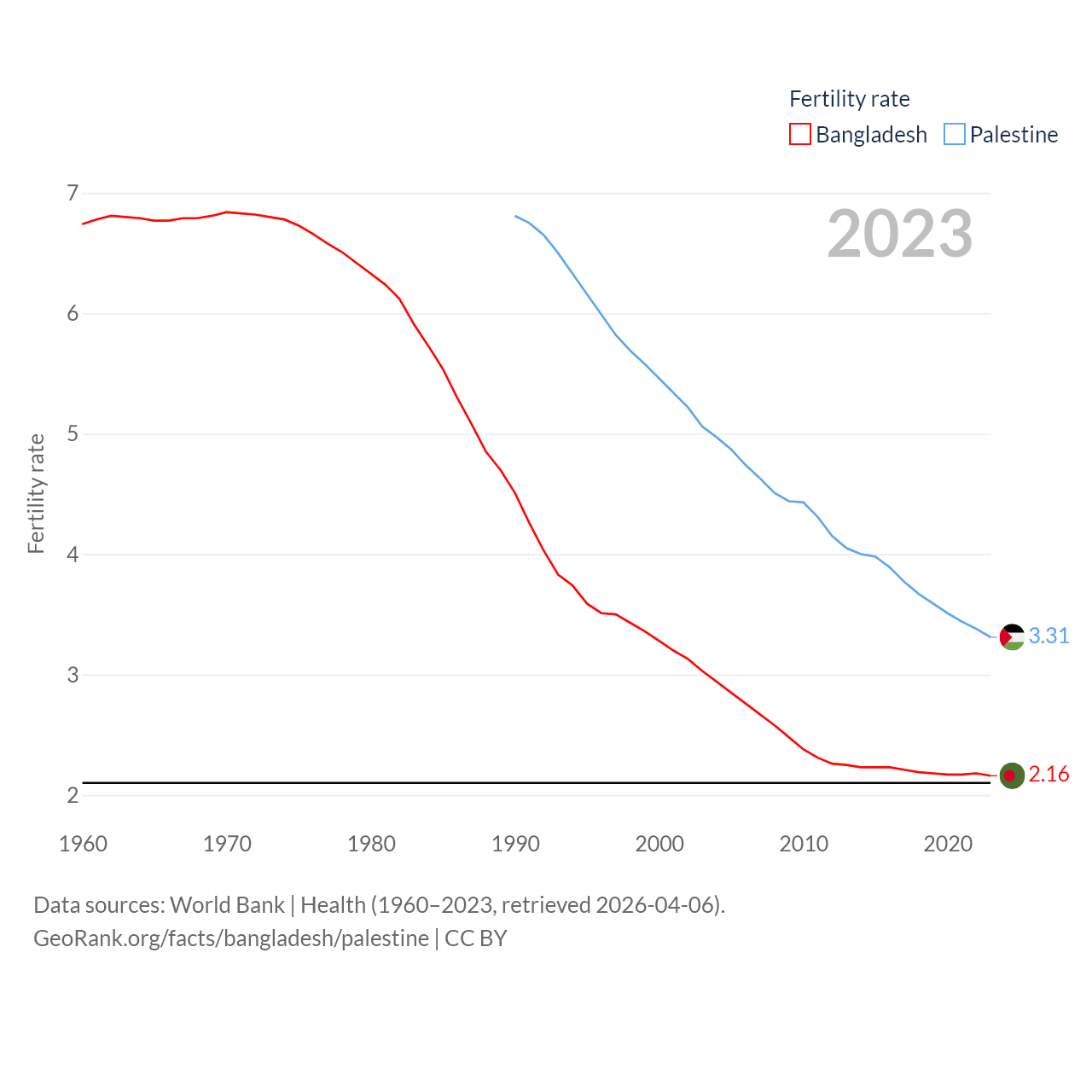 Bangladesh has a population of 174M (ranked 8/197), compared with 5.29M in Palestine (ranked 122/197). Bangladesh's land area is 50,186 sq mi versus 2,326 sq mi for Palestine (ranked 94th vs. 164th).
