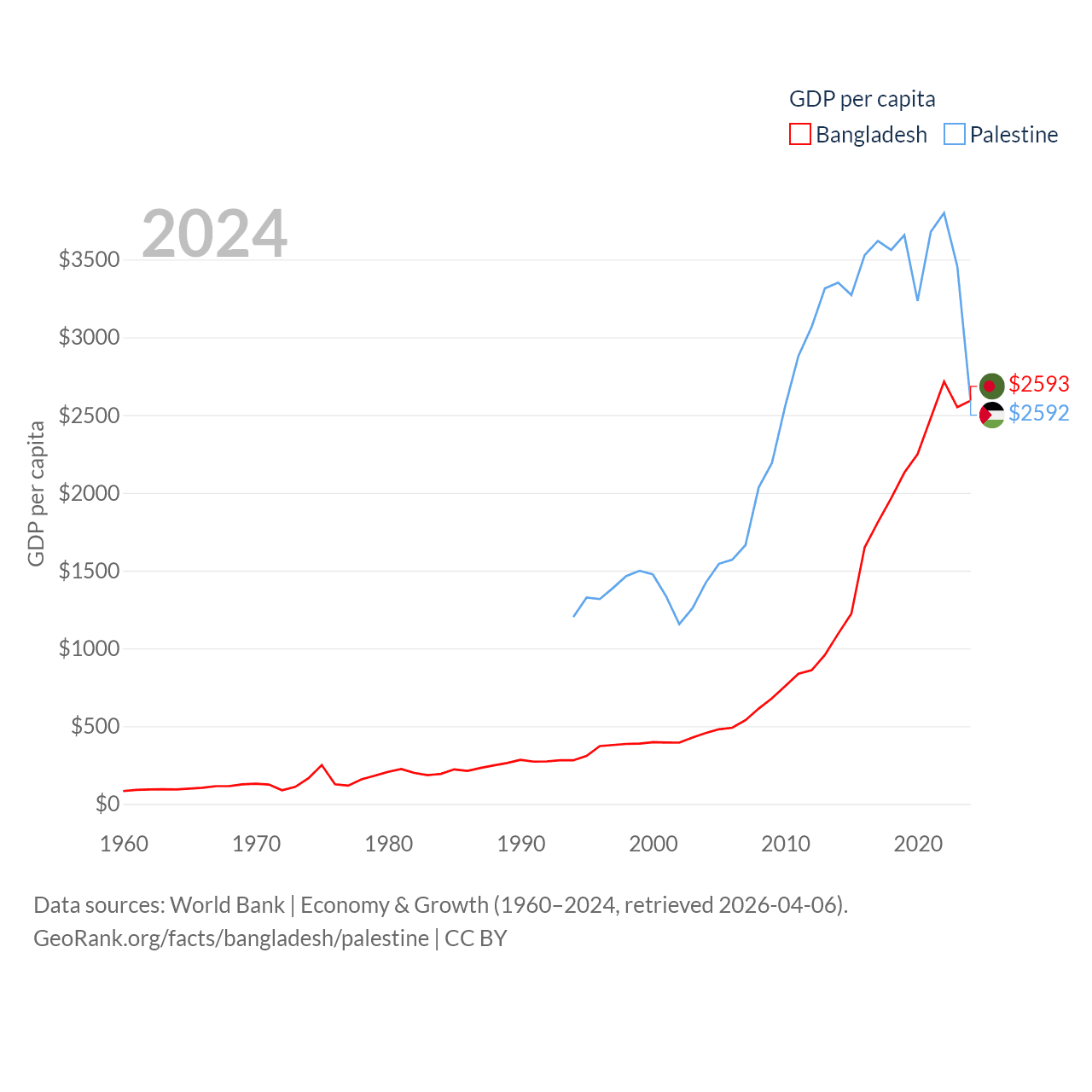 By GDP, Bangladesh ranks 36/197 ($450B) and Palestine ranks 146/197 ($13.7B). By GDP per capita, Bangladesh ranks 146/197 ($2,593), while Palestine ranks 147/197 ($2,592).
