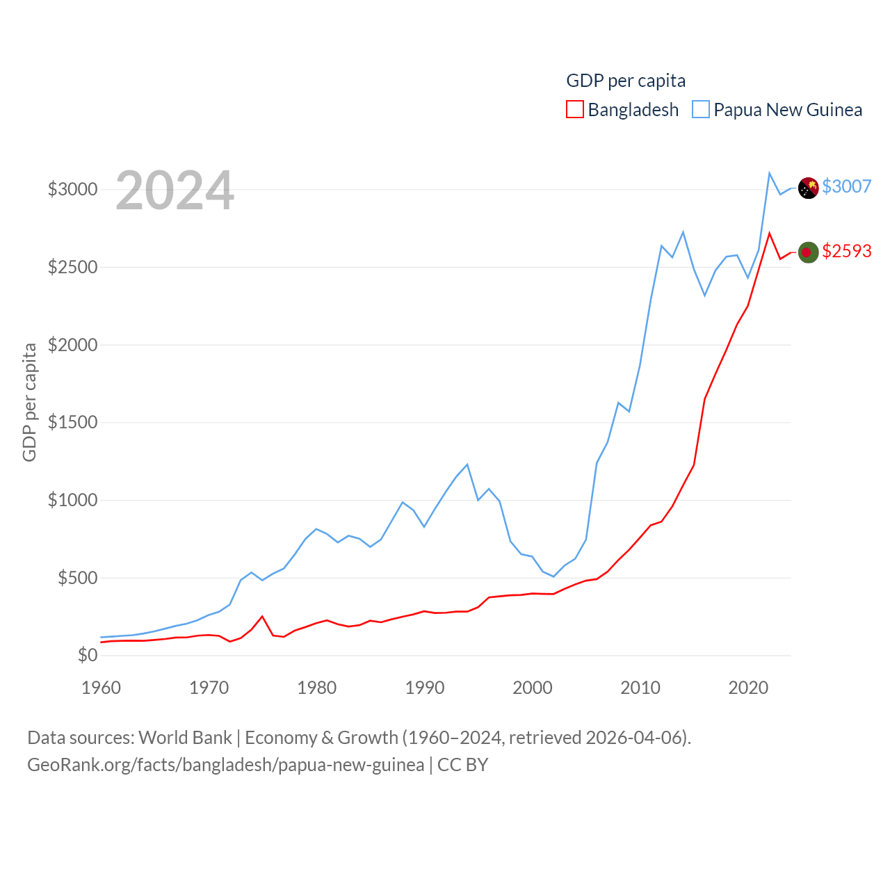 By GDP, Bangladesh ranks 36/197 ($450B) and Papua New Guinea ranks 110/197 ($31.8B). By GDP per capita, Bangladesh ranks 146/197 ($2,593), while Papua New Guinea ranks 140/197 ($3,007).