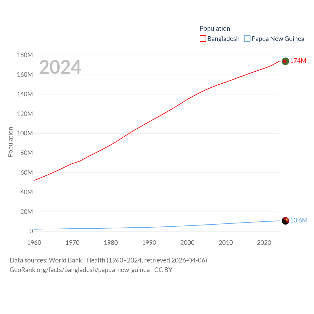 Bangladesh has a population of 174M (ranked 8/197), compared with 10.6M in Papua New Guinea (ranked 92/197). Bangladesh's land area is 50,186 sq mi versus 174,850 sq mi for Papua New Guinea (ranked 94th vs. 54th).