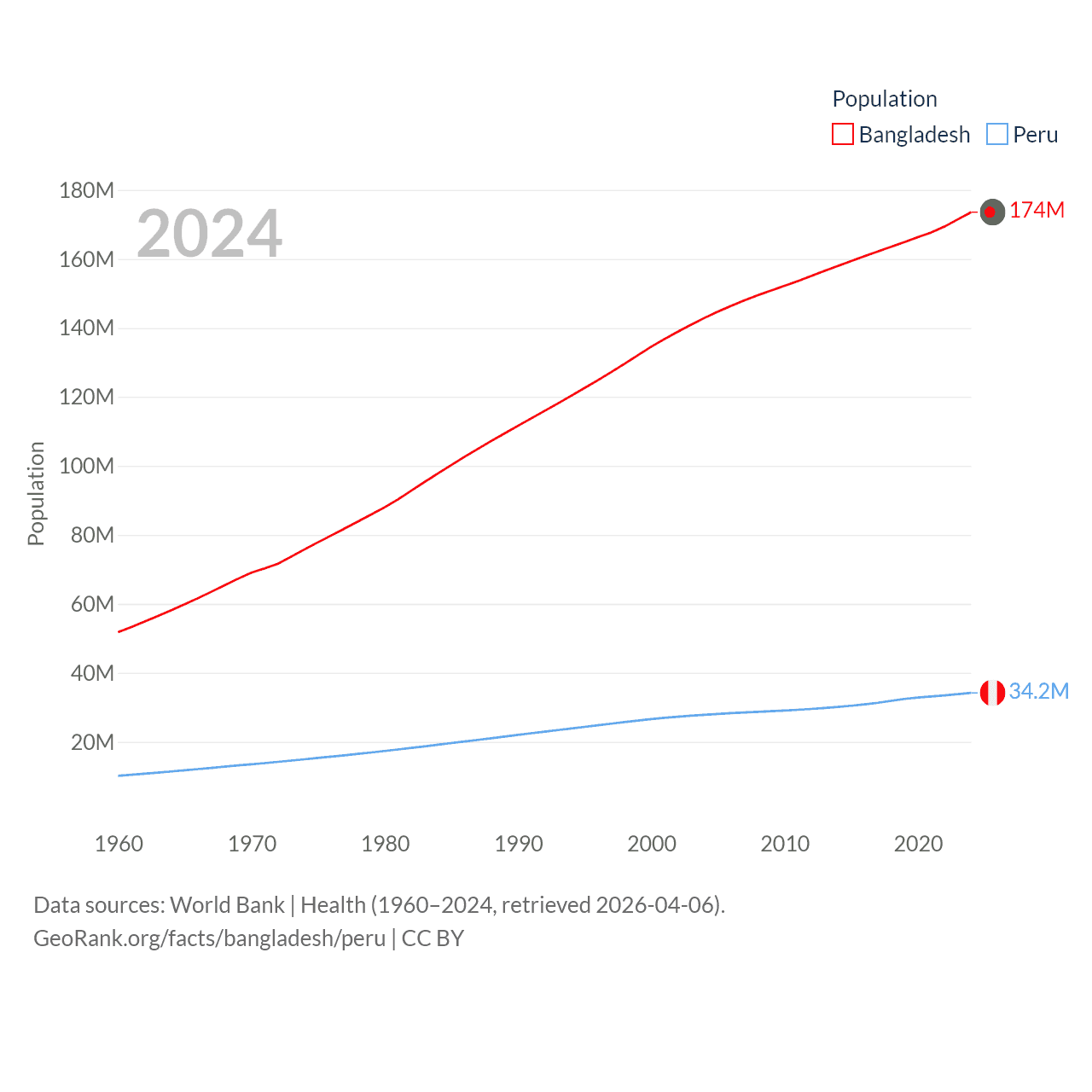 Bangladesh has a population of 174M (ranked 8/197), compared with 34.2M in Peru (ranked 48/197). Bangladesh's land area is 50,186 sq mi versus 494,211 sq mi for Peru (ranked 94th vs. 19th).