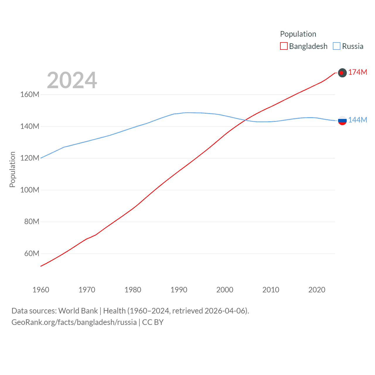 Bangladesh has a population of 174M (ranked 8/197), compared with 144M in Russia (ranked 9/197). Bangladesh's land area is 50,186 sq mi versus 6,323,145 sq mi for Russia (ranked 94th vs. 1st).