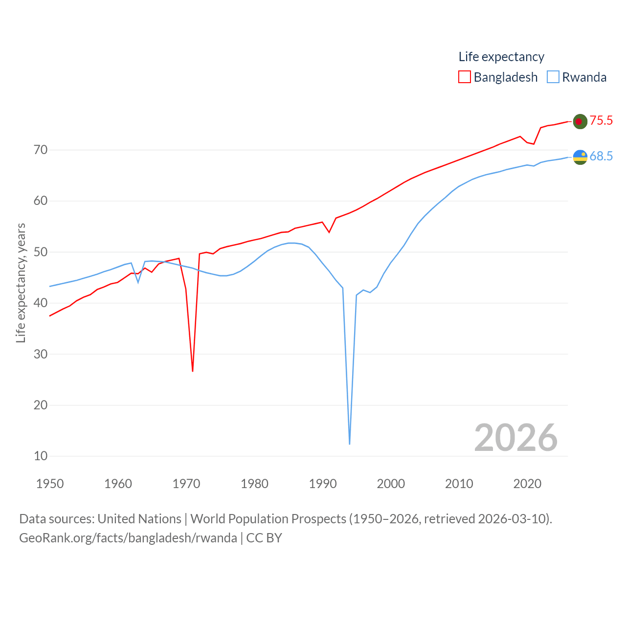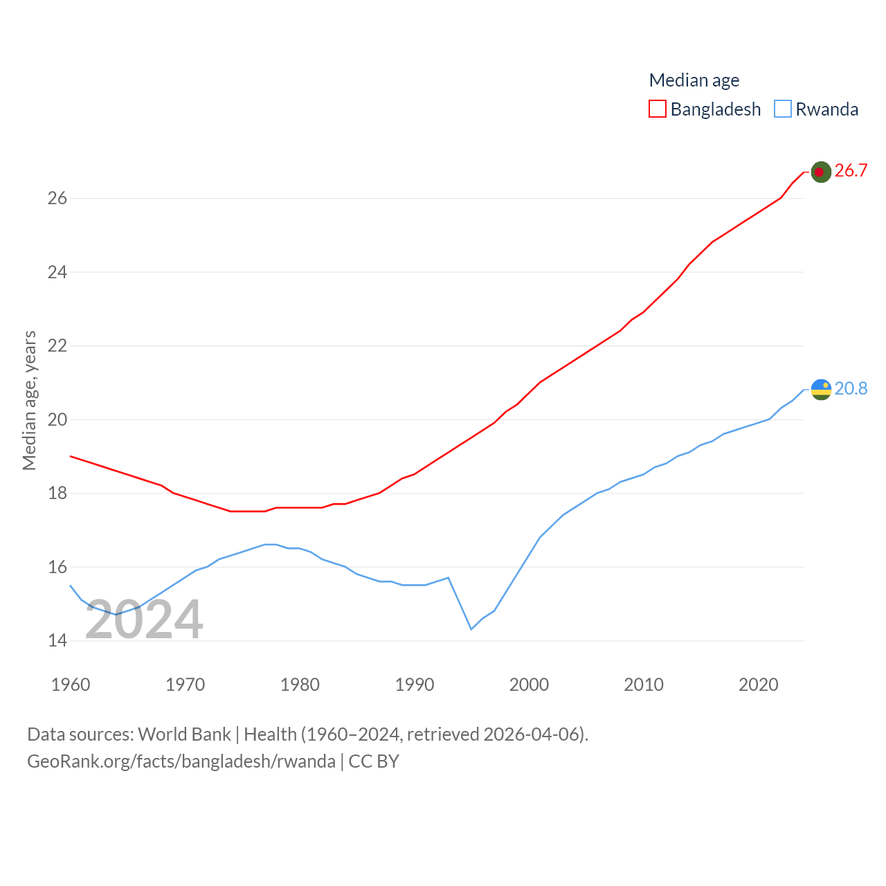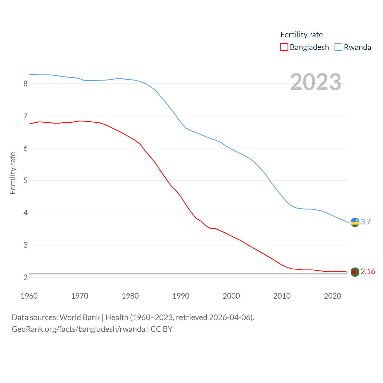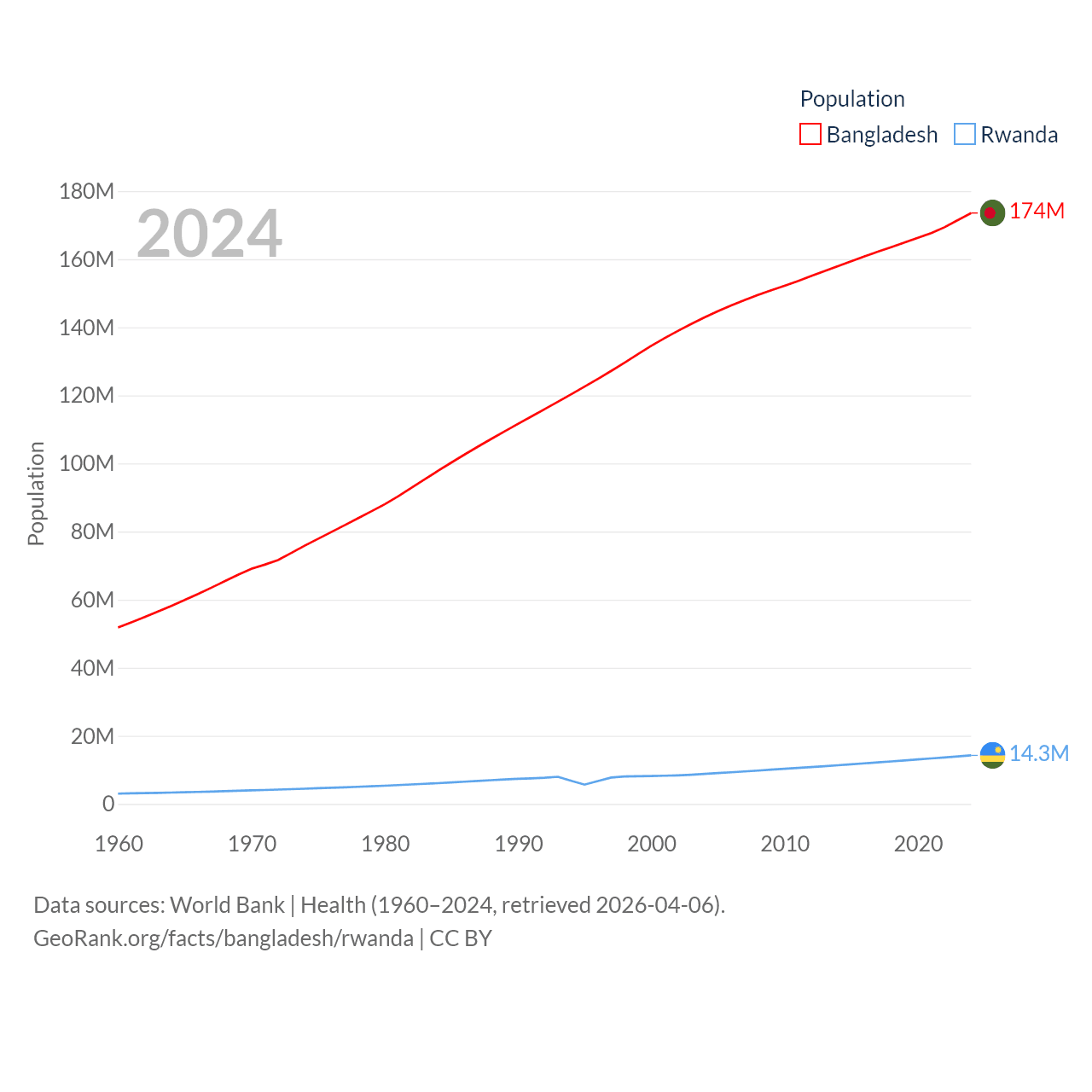 Bangladesh has a population of 174M (ranked 8/197), compared with 14.3M in Rwanda (ranked 77/197). Bangladesh's land area is 50,186 sq mi versus 9,525 sq mi for Rwanda (ranked 94th vs. 146th).