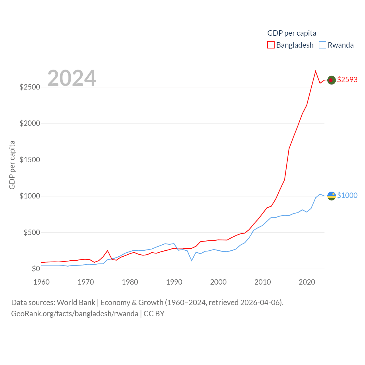 By GDP, Bangladesh ranks 36/197 ($450B) and Rwanda ranks 144/197 ($14.3B). By GDP per capita, Bangladesh ranks 146/197 ($2,593), while Rwanda ranks 178/197 ($1,000).