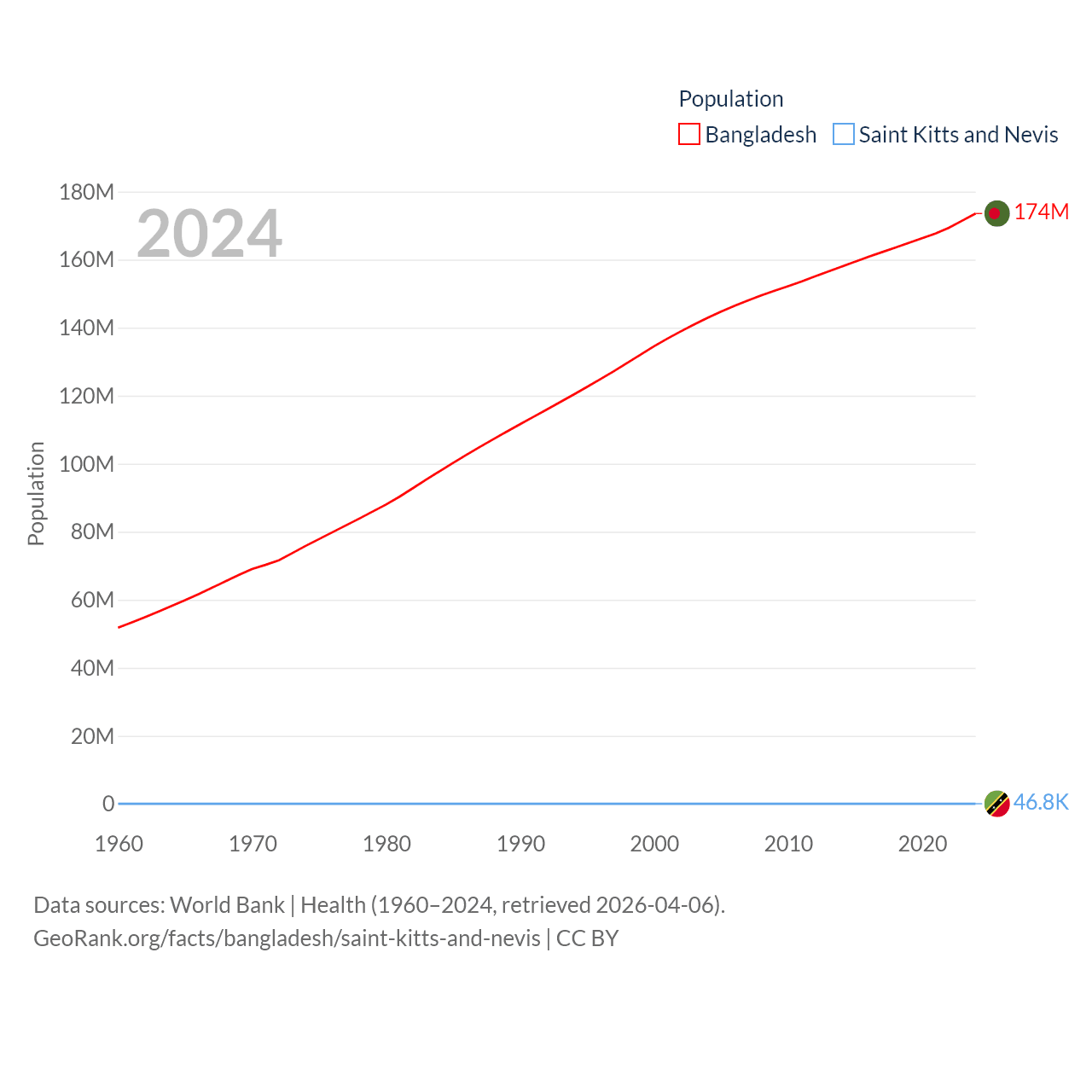 Bangladesh has a population of 174M (ranked 8/197), compared with 46.8K in Saint Kitts and Nevis (ranked 189/197). Bangladesh's land area is 50,186 sq mi versus 100.4 sq mi for Saint Kitts and Nevis (ranked 94th vs. 189th).