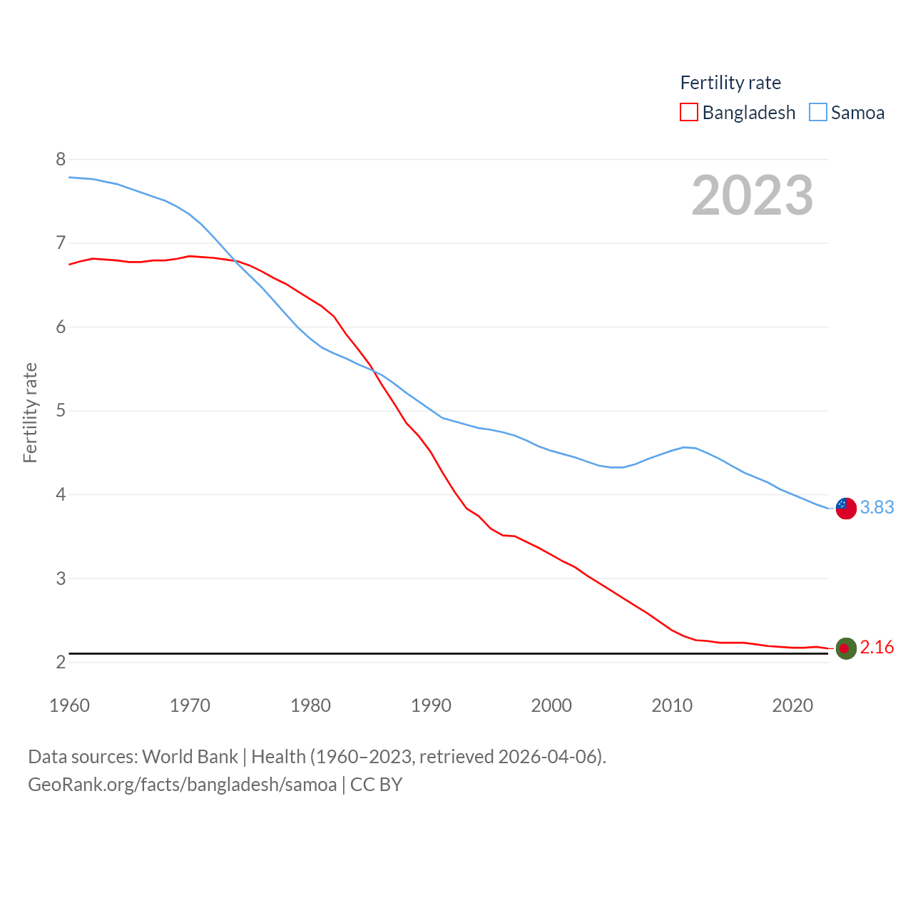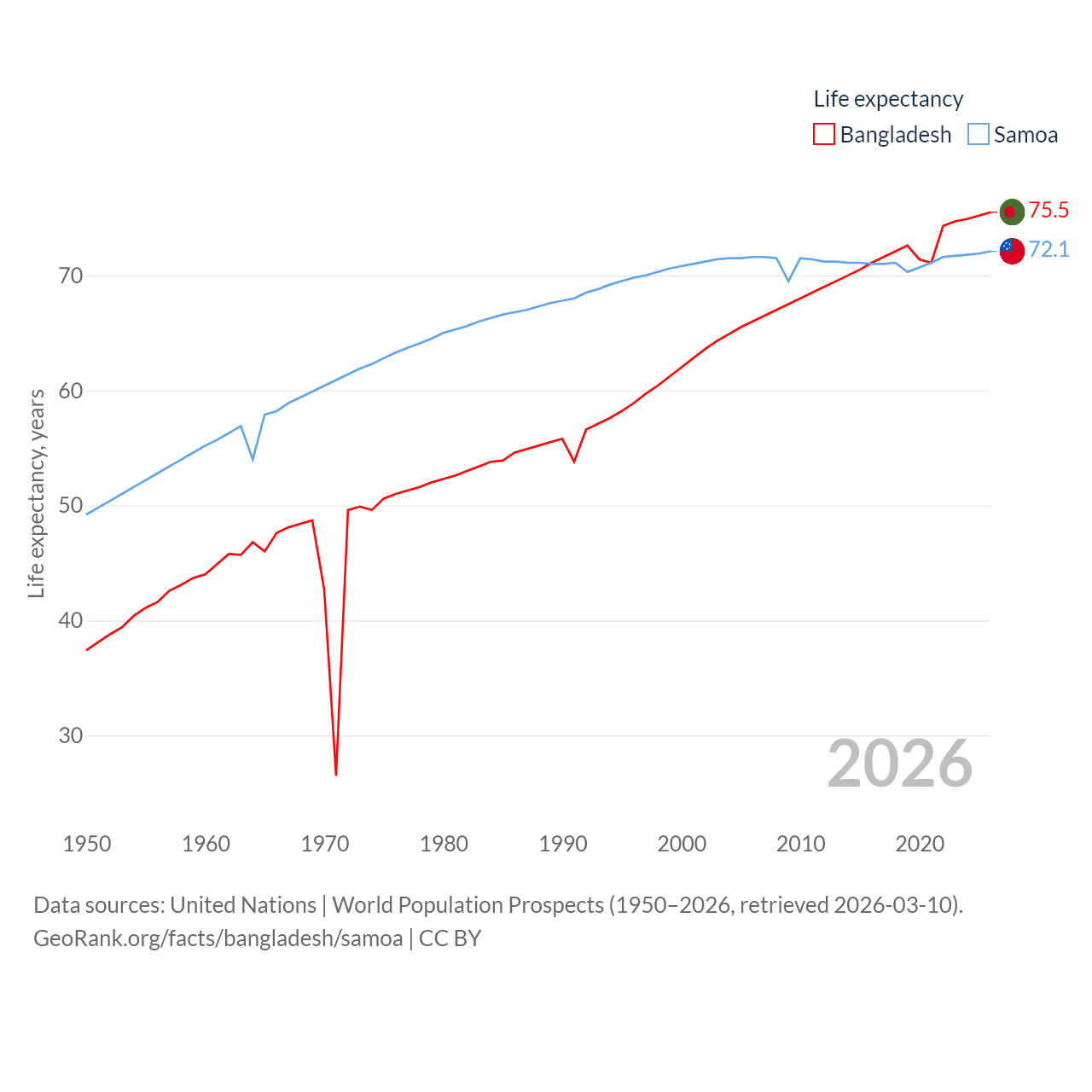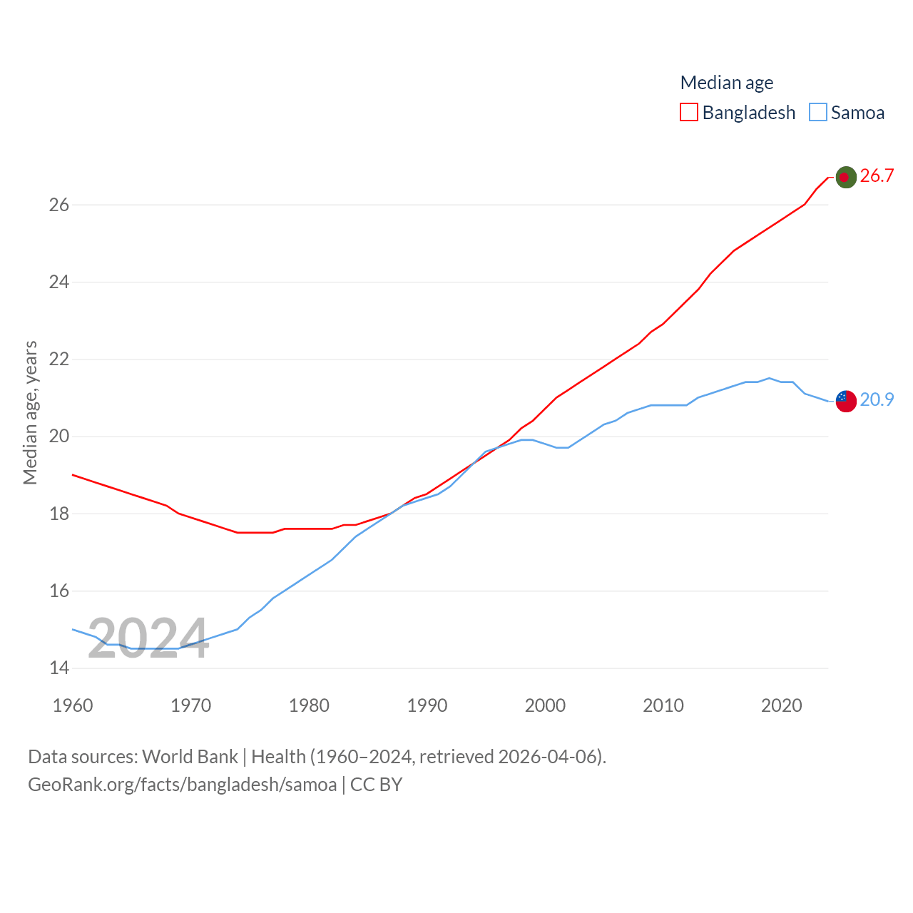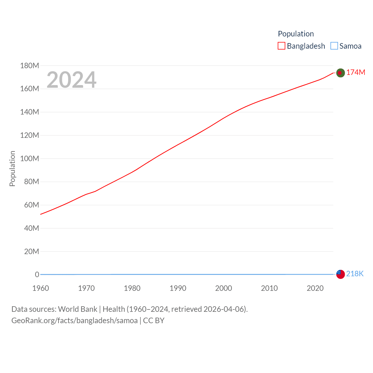 Bangladesh has a population of 174M (ranked 8/197), compared with 218K in Samoa (ranked 177/197). Bangladesh's land area is 50,186 sq mi versus 1,073 sq mi for Samoa (ranked 94th vs. 168th).
