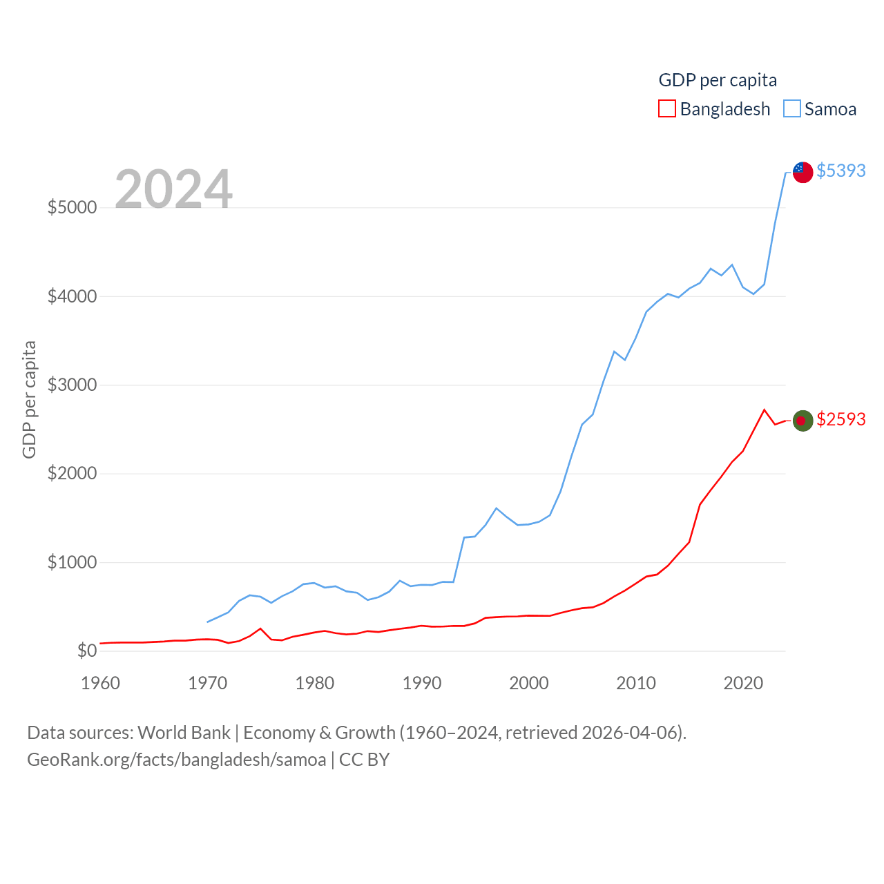 By GDP, Bangladesh ranks 36/197 ($450B) and Samoa ranks 185/197 ($1.18B). By GDP per capita, Bangladesh ranks 146/197 ($2,593), while Samoa ranks 117/197 ($5,393).