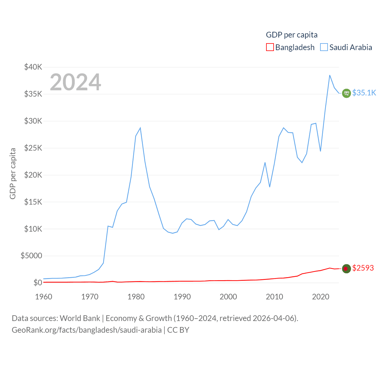 By GDP, Bangladesh ranks 36/197 ($450B) and Saudi Arabia ranks 18/197 ($1.24T). By GDP per capita, Bangladesh ranks 146/197 ($2,593), while Saudi Arabia ranks 33/197 ($35,122).