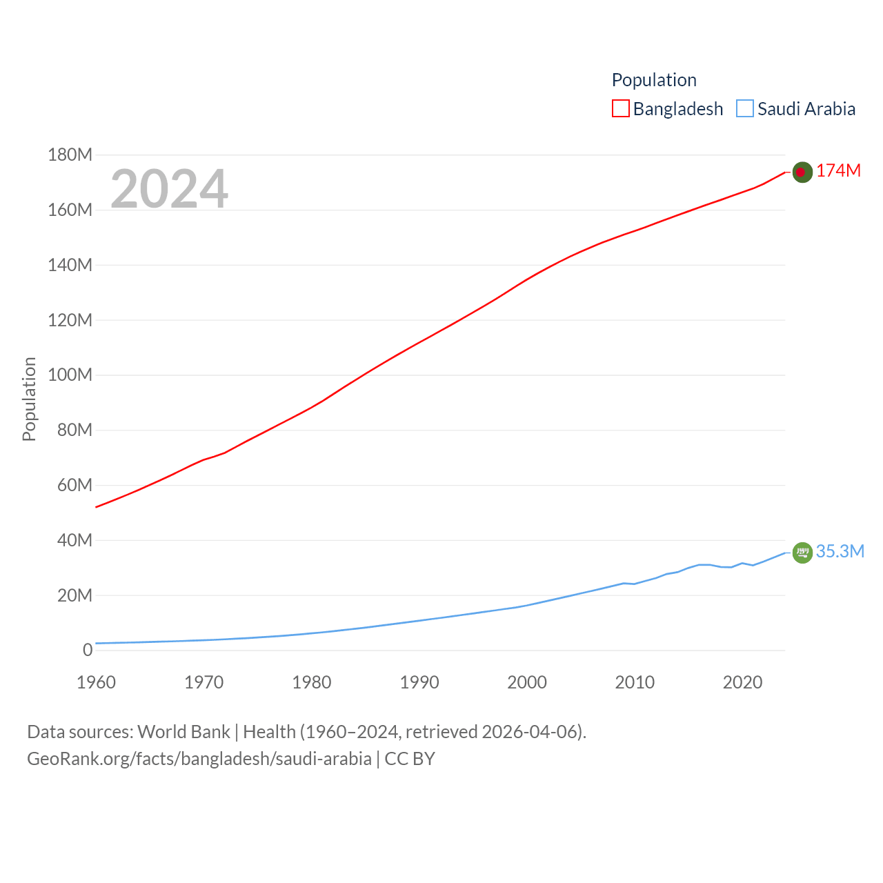Bangladesh has a population of 174M (ranked 8/197), compared with 35.3M in Saudi Arabia (ranked 45/197). Bangladesh's land area is 50,186 sq mi versus 830,000 sq mi for Saudi Arabia (ranked 94th vs. 12th).
